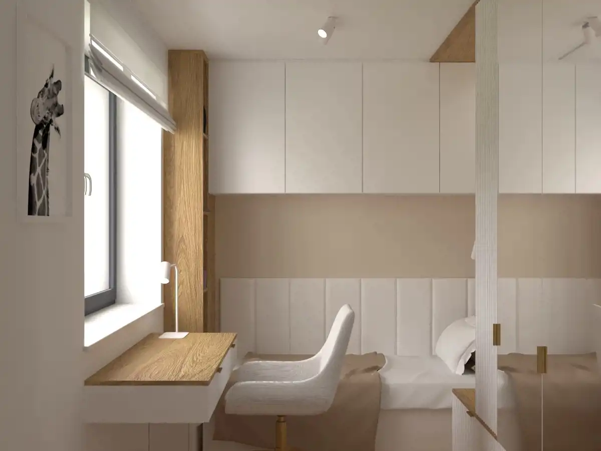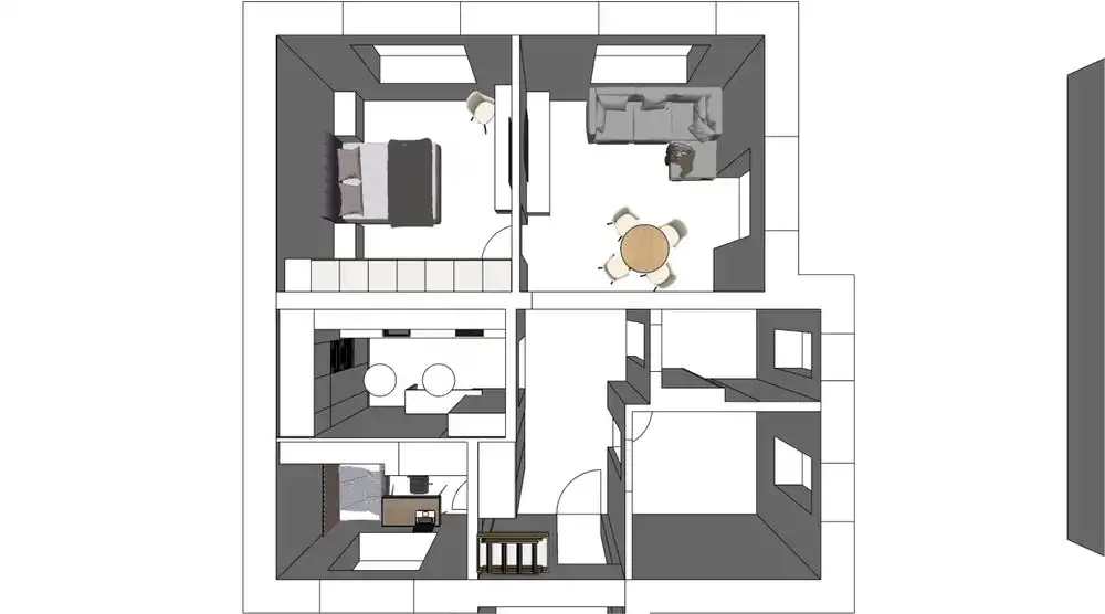 Składa się z salonu, 3 sypialni, kuchni, łazienki.