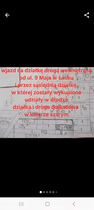 Wjazd drogą utwardzoną od ul. 9 Maja w Łasku. Szerokość drogi wewnętrznej 4 m.