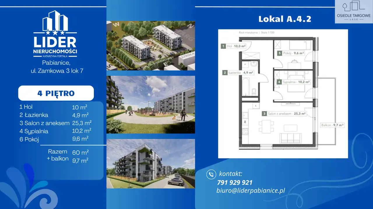 Oferujemy na sprzedaż nowoczesne i funkcjonalne mieszkania o powierzchni od 45,4 m² do 73 m² w inwestycji Osiedle Targowe w Łasku. Inwestycja posiada udogodnienia takie jak: parking podziemny, boksy parkingowe i komórki lokatorskie. Budynek posiada eleganckie części wspólne wyposażone w windę, cały teren obiektu jest funkcjonalnie zaprojektowany z zielonymi częściami wspólnymi oraz placem zabaw.