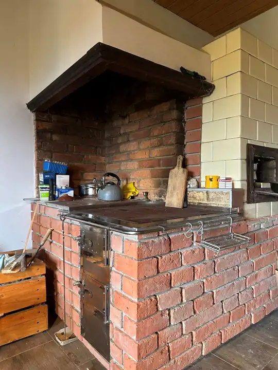 w kuchni piec kaflowy, w pokojach dodatkowo kominki.