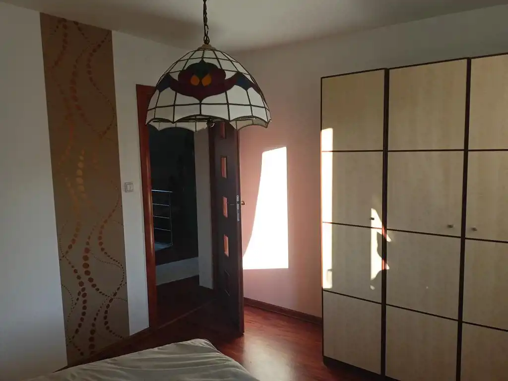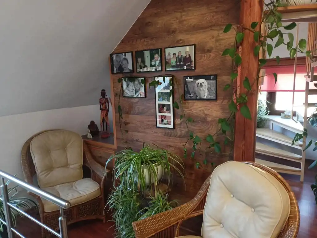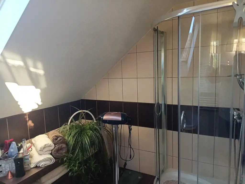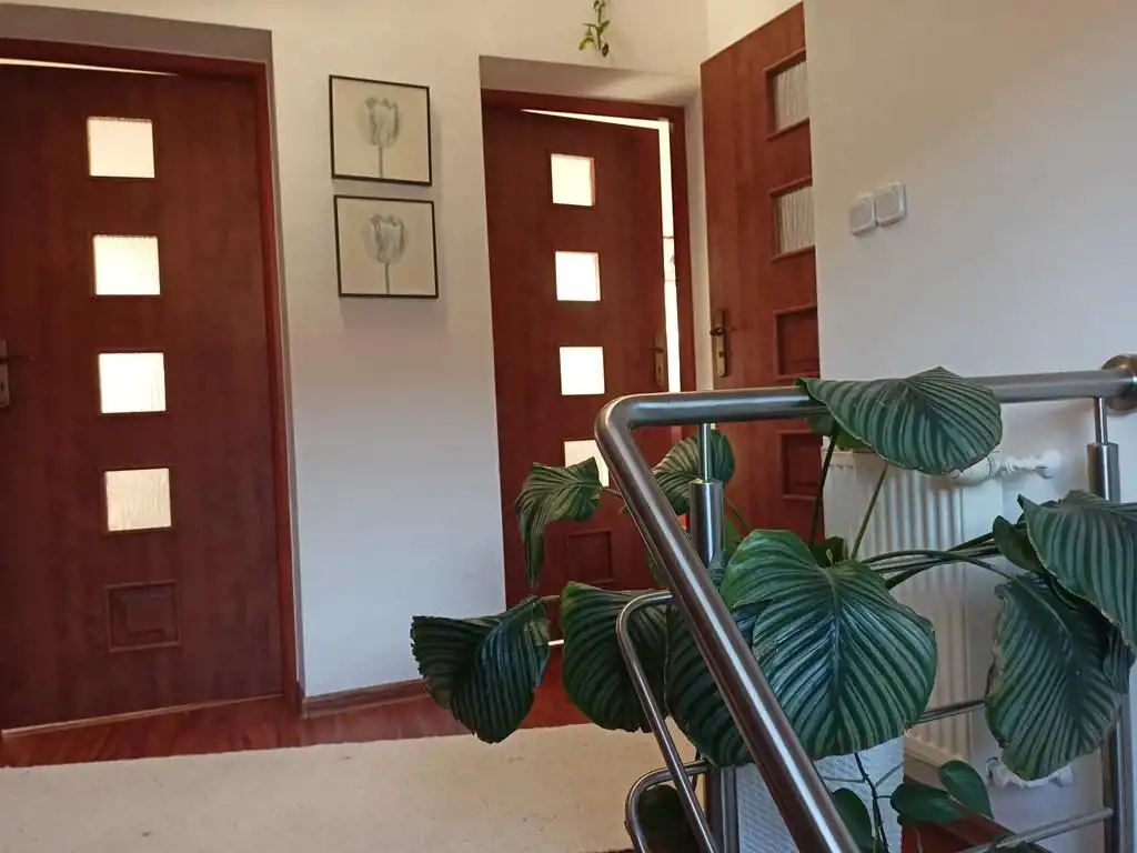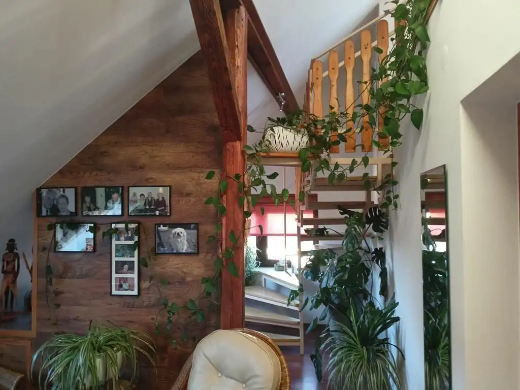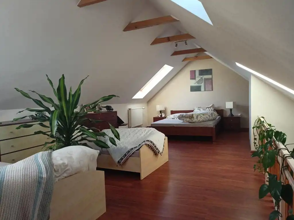 Piętro: dwa pokoje (oba z wyjściem na balkon), duża łazienka plus antresola w której urządzono sypialnię.