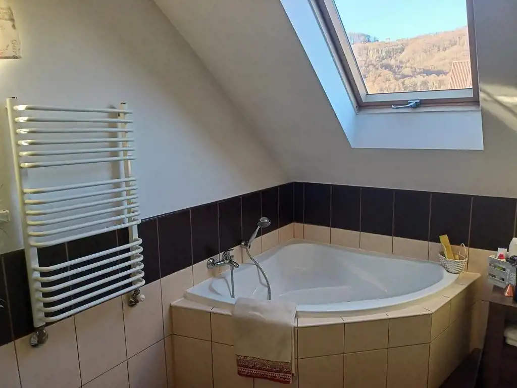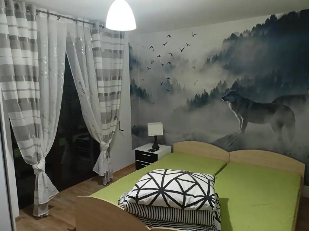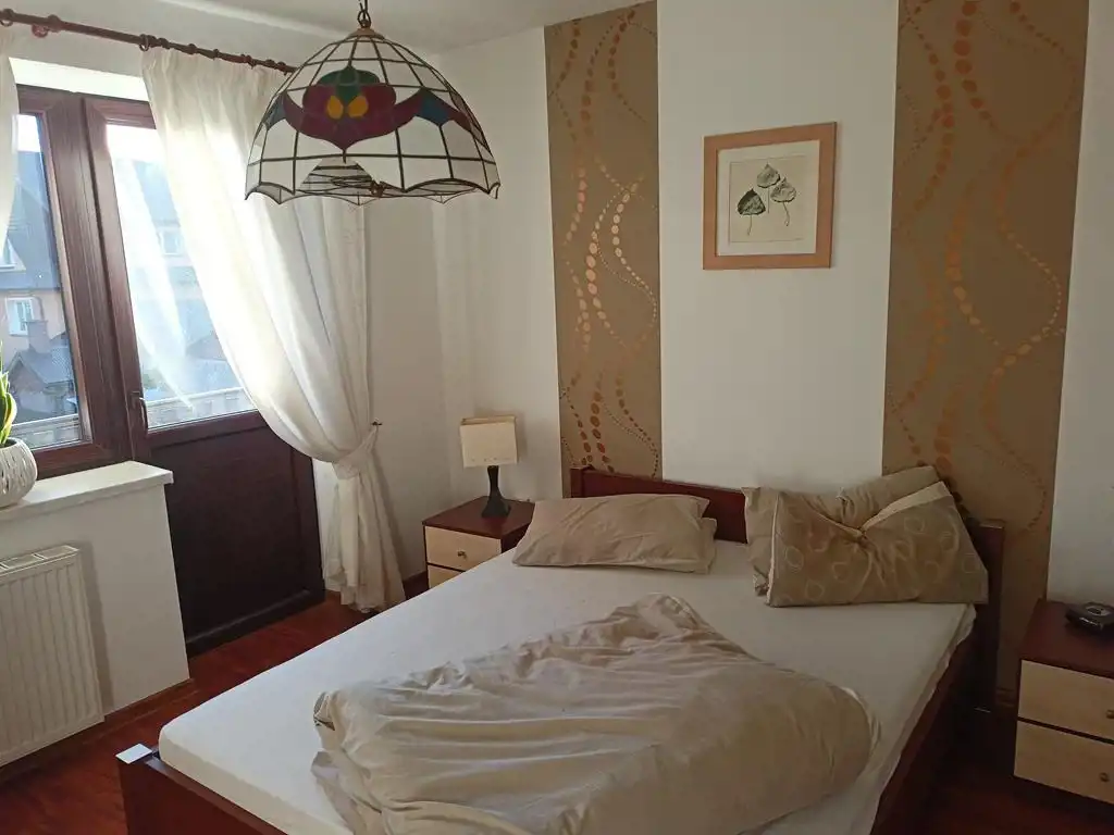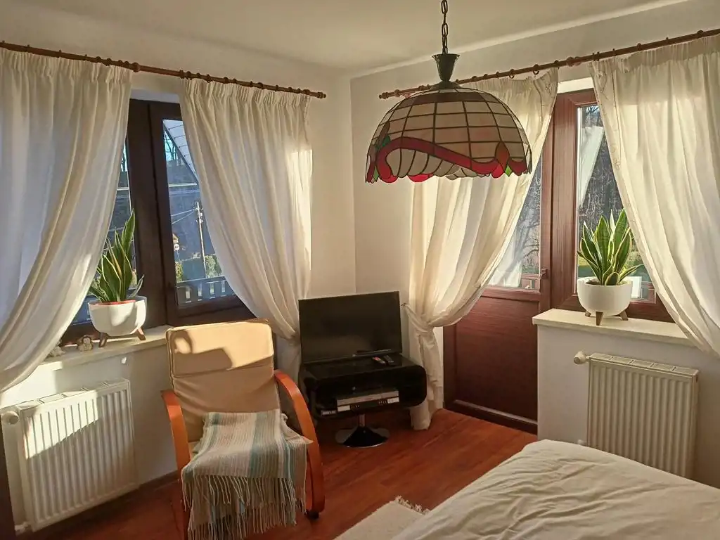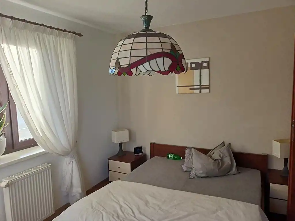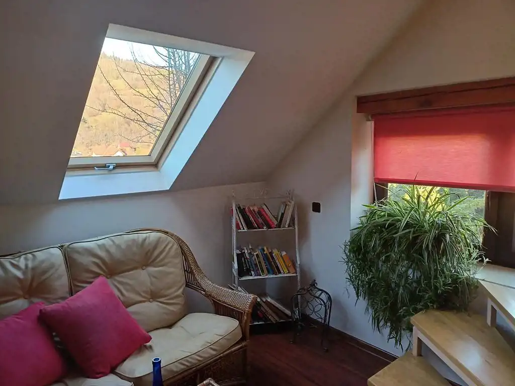 Piętro: dwa pokoje (oba z wyjściem na balkon), duża łazienka plus antresola w której urządzono sypialnię.