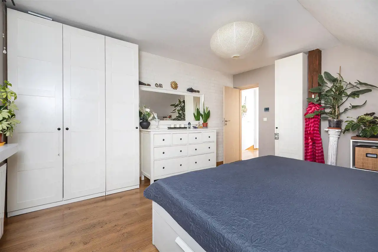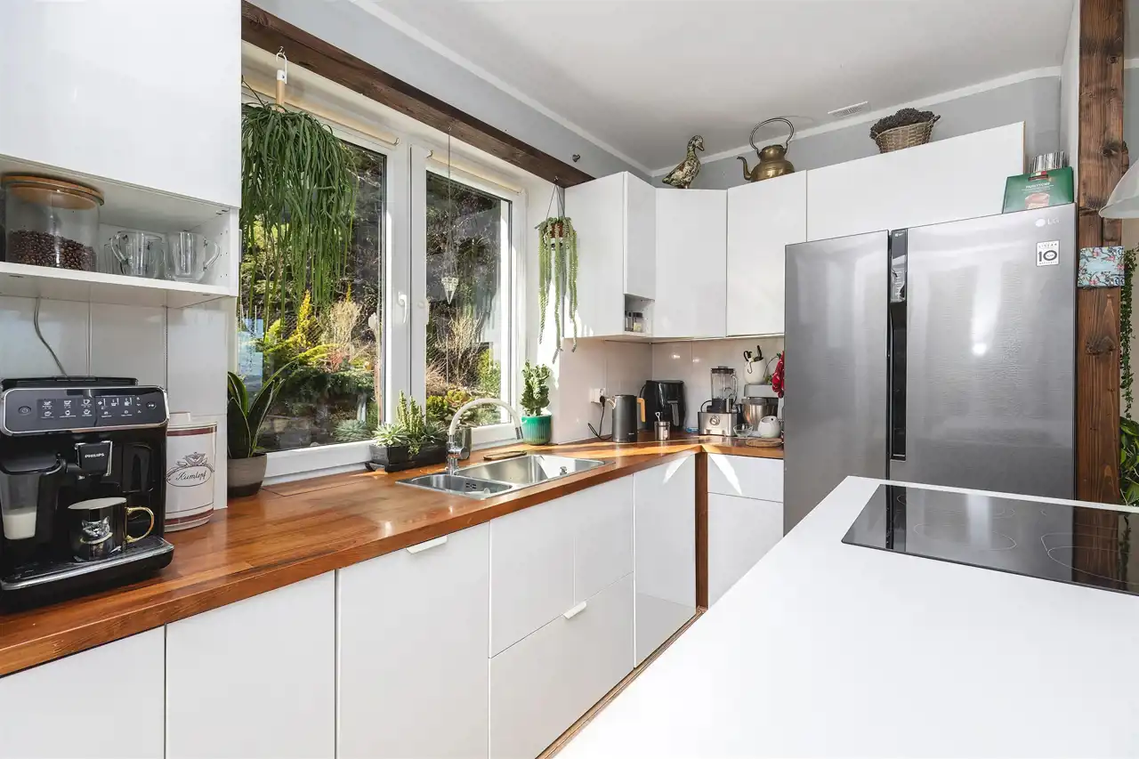 Powierzchnia użytkowa wynosi 140 m², rozmieszczona na dwóch kondygnacjach połączonych eleganckimi schodami z drewna jesionowego.