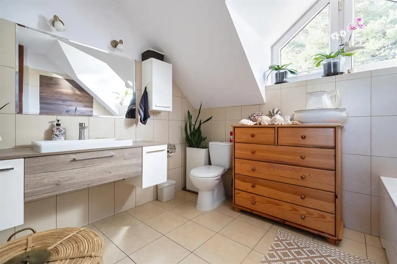 • Piętro: cztery duże sypialnie oraz druga łazienka z wanną.