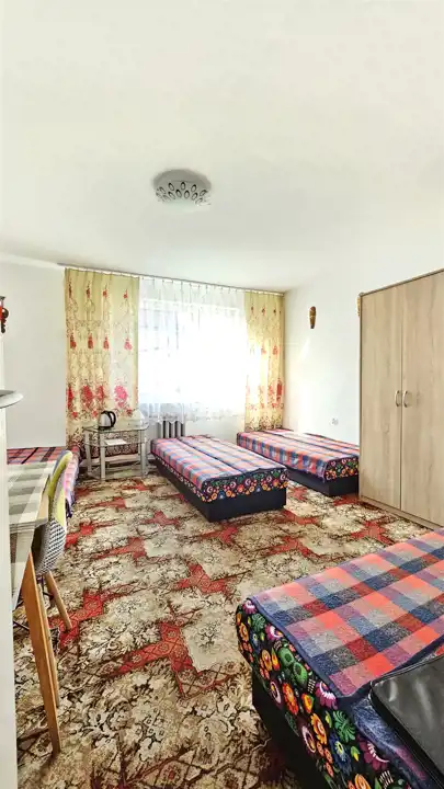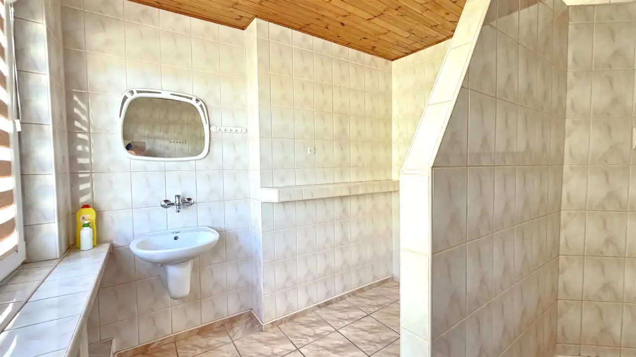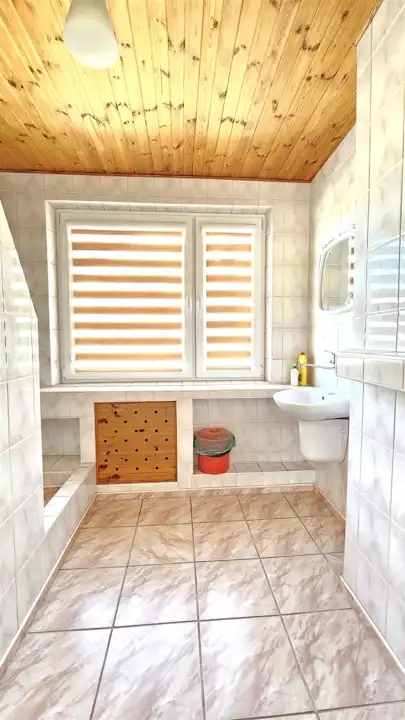 Na parterze znajduje się wygodna część mieszkalna, która składa się z dwóch przestronnych pokoi (po 16m2 każdy), funkcjonalnej kuchni z jadalnią (10m2) oraz łazienki połączonej z kotłownią (wyposażoną w system ogrzewania na opał BIO oraz paliwo stałe, z dwoma bojlerami). Pod schodami umieszczono dwa pomieszczenia gospodarcze, zapewniające dodatkową przestrzeń. Od strony podwórka znajduje się oddzielne wejście, prowadzące do dwóch przytulnych pokoi dwuosobowych (każdy o powierzchni 8,5m2).