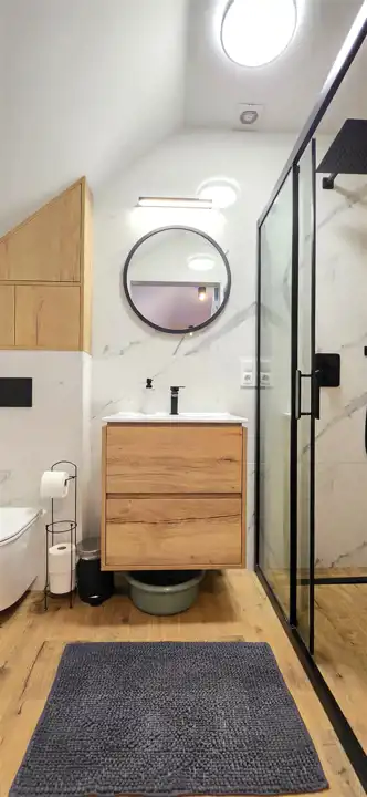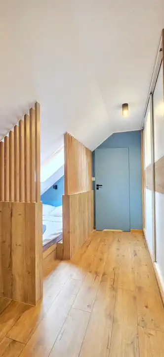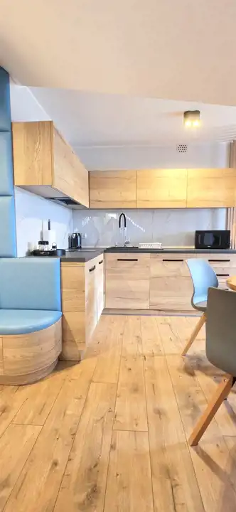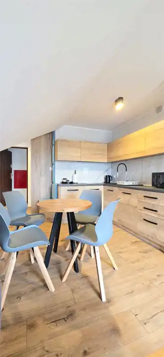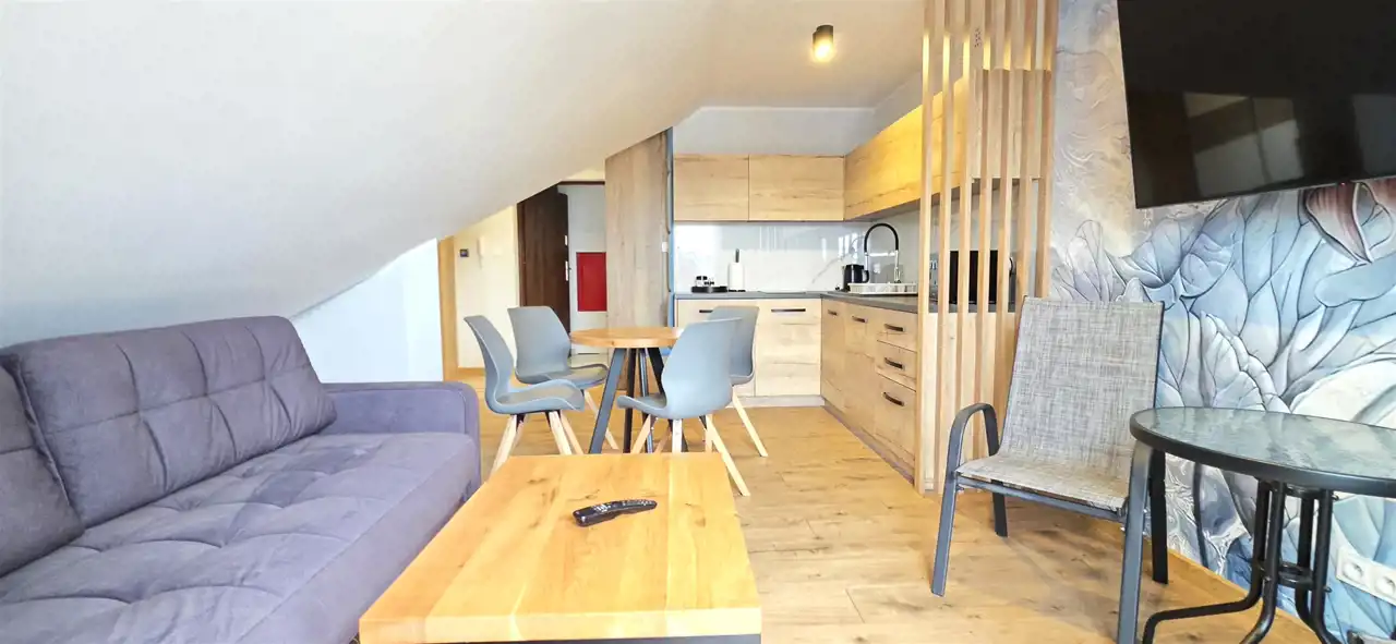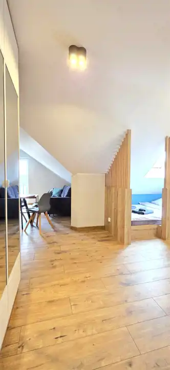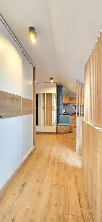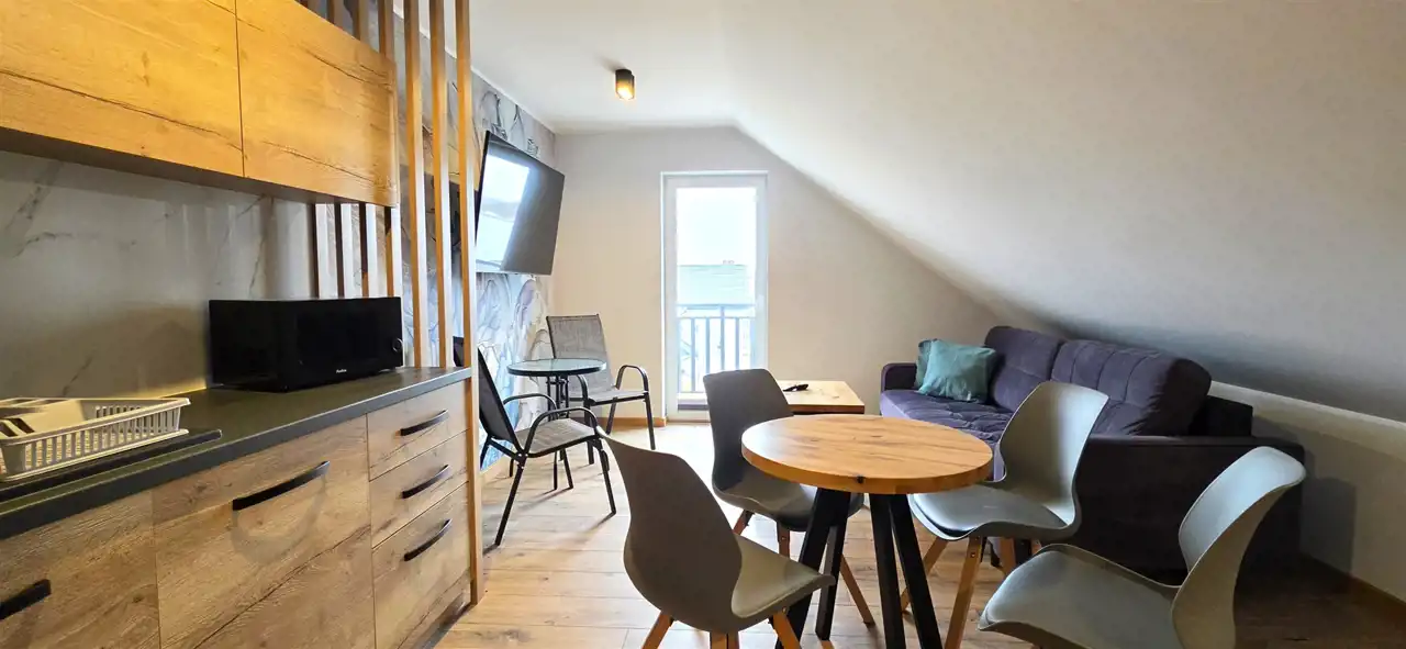 Mieszkanie składa się z przedpokoju, pokoju dziennego z zabudowanym, wyposażonym aneksem kuchennym, z wyjściem na balkon, sypialni oddzielonej dekoracyjnymi lamelami zapewniając poczucie prywatności oraz łazienki z WC i prysznicem.
