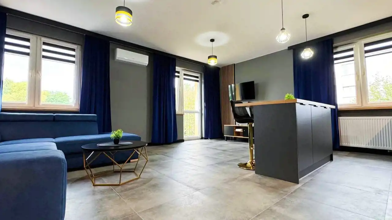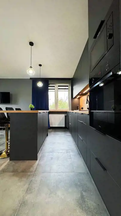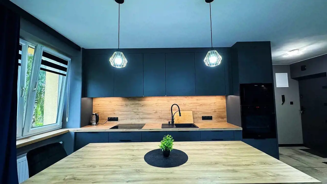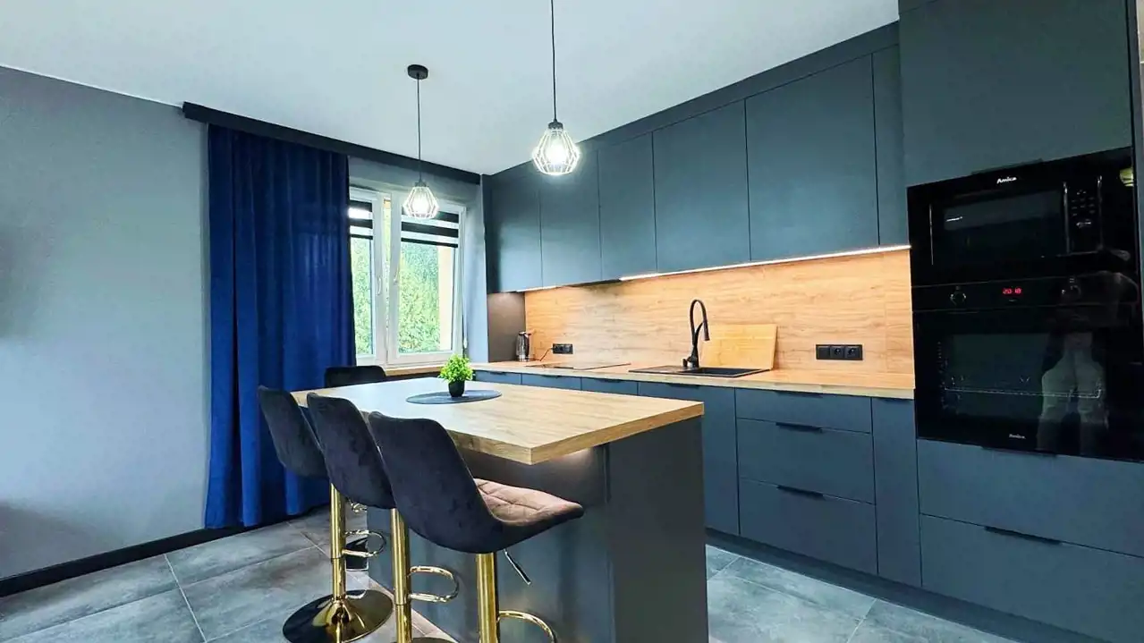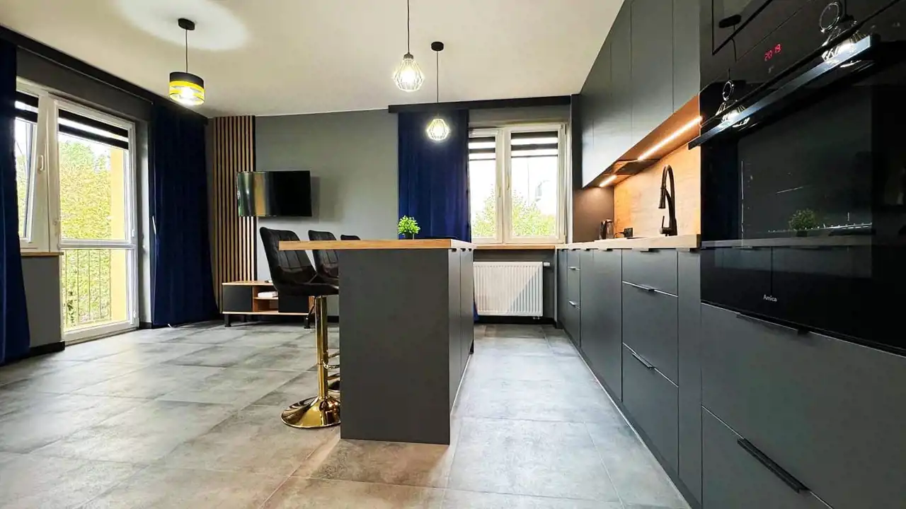 -przestronnego, w pełni wyposażonego aneksu kuchennego z salonem z wyjściem na balkon. Aneks kuchenny zrobiony pod wymiar, wyposażony w oświetlenie LED-owe,