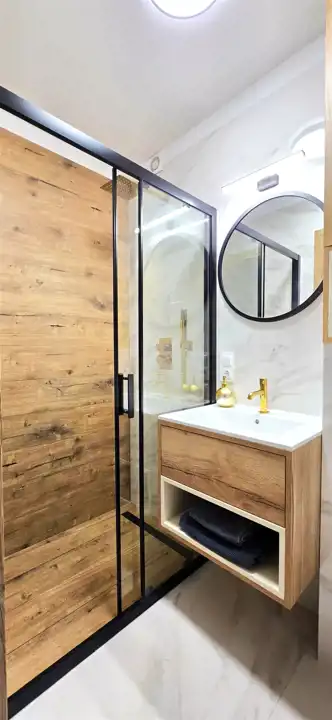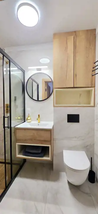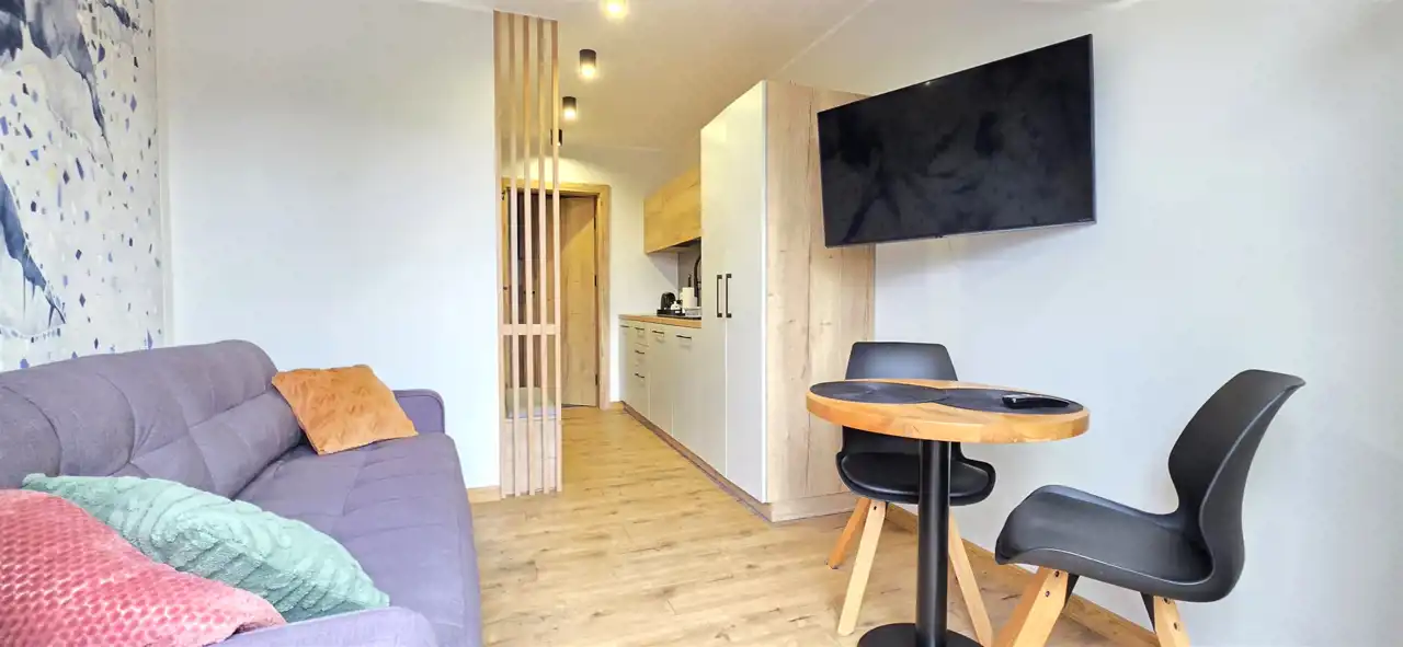 Pierwsze mieszkanie składa się z przedpokoju, pokoju dziennego z zabudowanym, wyposażonym aneksem kuchennym i z wyjściem na balkon, sypialni oraz łazienki z WC i prysznicem.