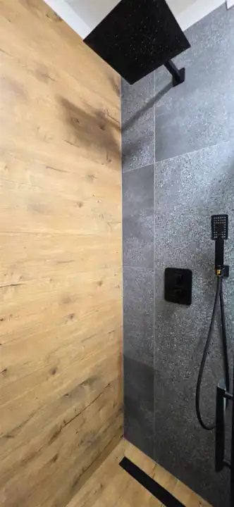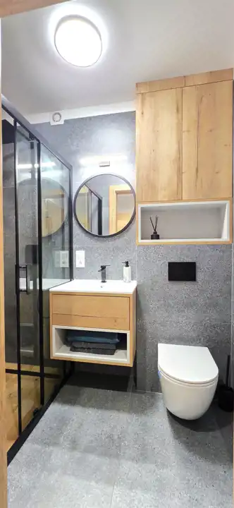 Drugie mieszkanie składa się przedpokoju, pokoju dziennego z aneksem kuchennym, z wyjściem na w/w balkon, sypialni oraz łazienki z WC i prysznicem.
