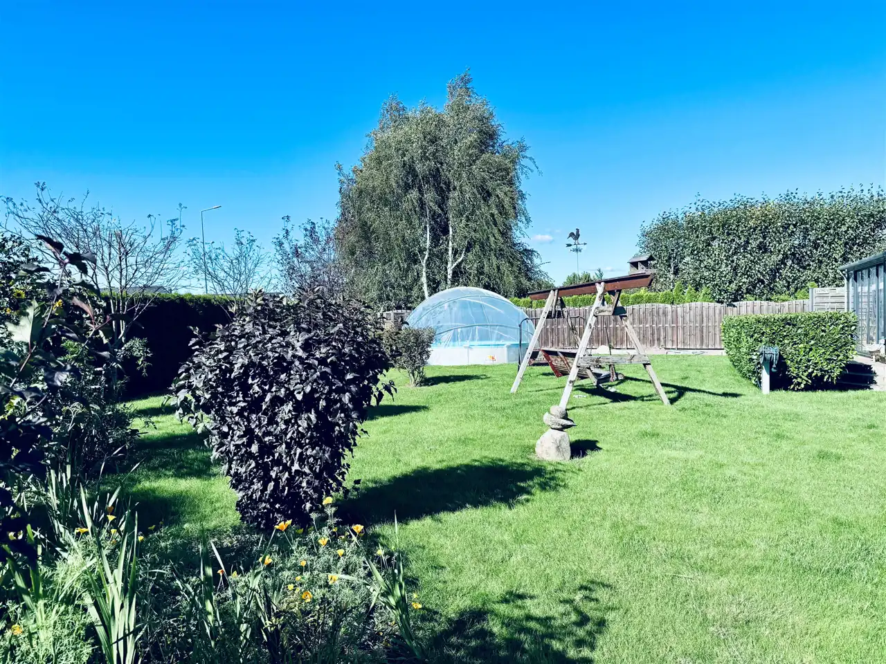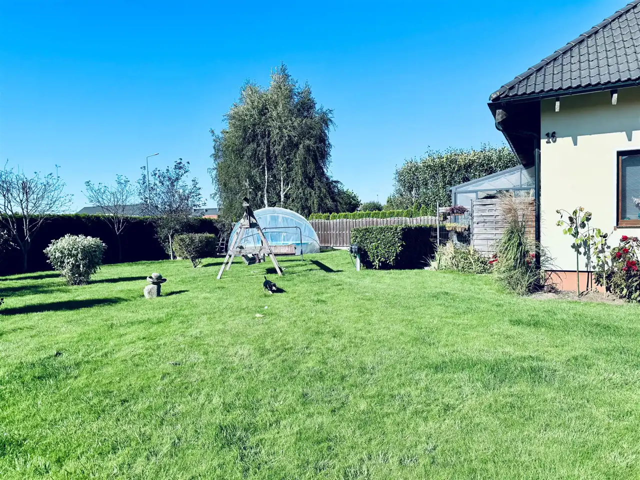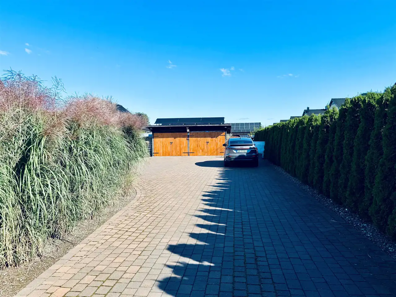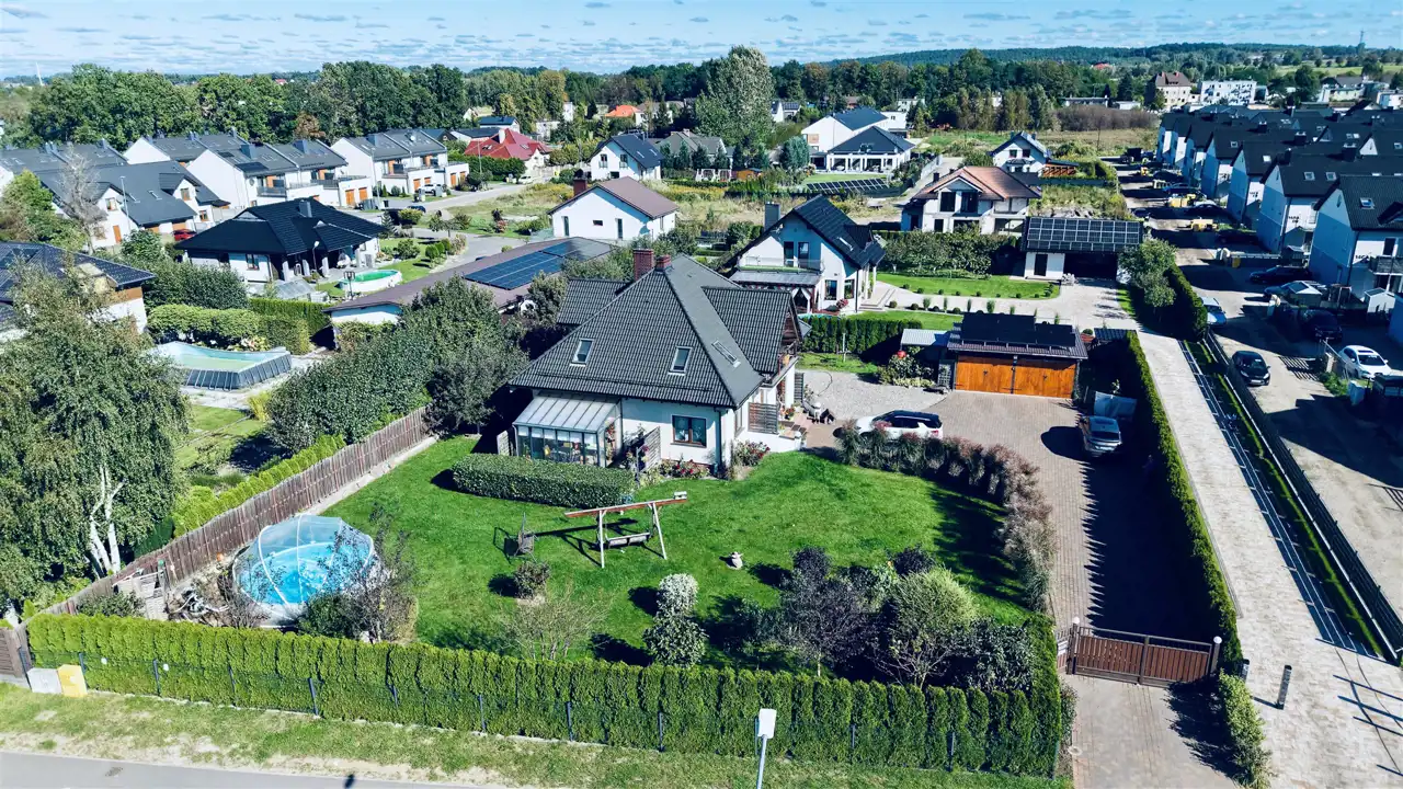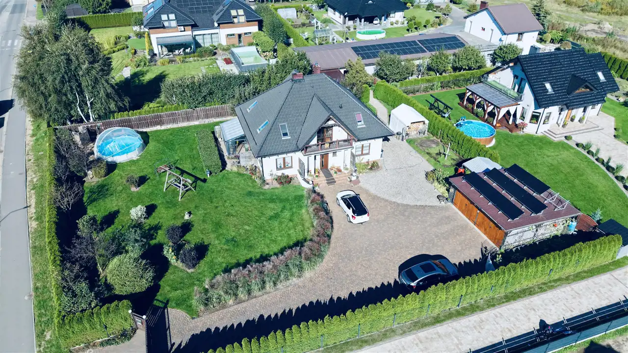Zadbany ogród z nasadzeniami ozdobnymi i drzewami, utwardzony podjazd, kostka brukowa, plac zabaw dla dzieci oraz przestrzeń do relaksu sprawiają, że to miejsce ma wyjątkowy, rodzinny charakter.