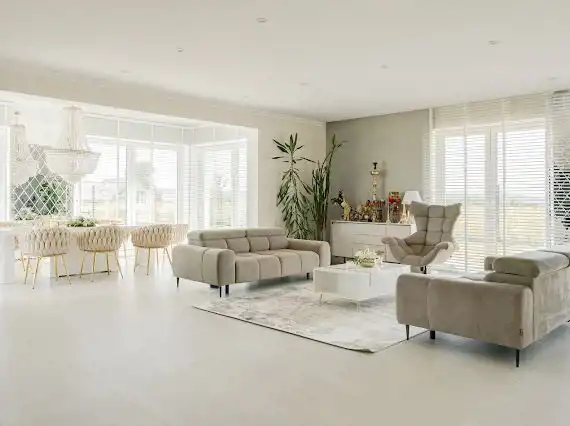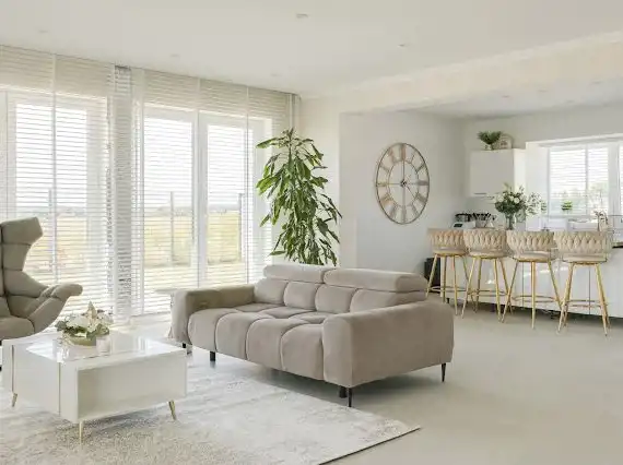 Przestronny salon z jadalnią, z dużymi przeszkleniami i wyjściem na taras;