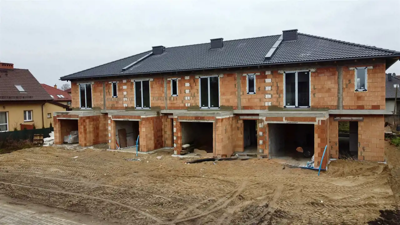 - stan wykończenia budynków – deweloperski (elewacja tynk silikatowy, ocieplenie styropianem 15 cm, okna PCV firmy DRUTEX 3 szybowe, parapety zewnętrzne, ściany na parterze i piętrze wykończone tynkiem cementowo-wapiennym, posadzki cementowe, brama garażowa sterowana pilotem)
