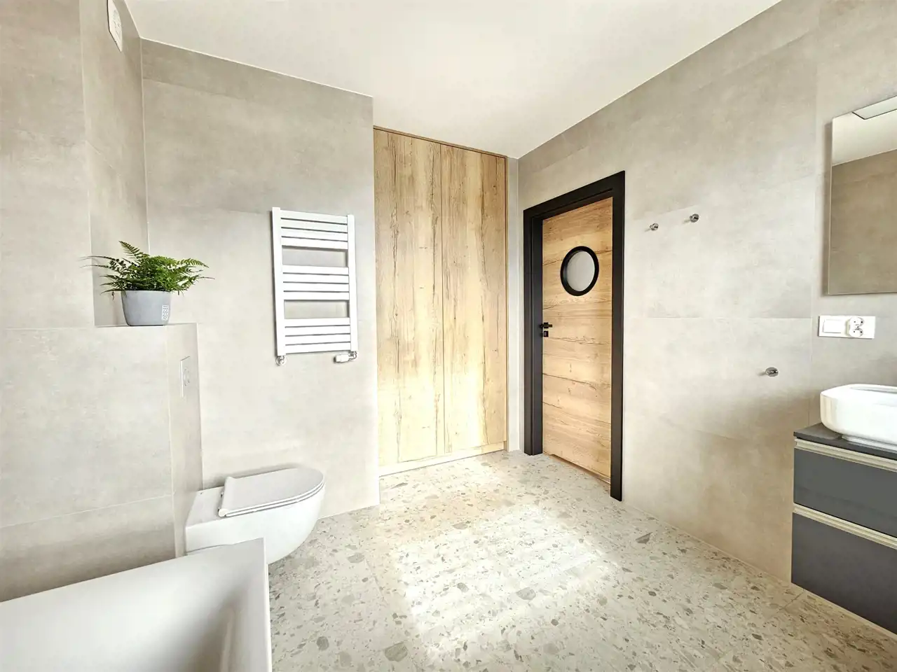 -piętra, na którym znajduje się korytarz, sypialnia z garderobą, 2 pokoje, pomieszczenie gospodarcze (pralnia) oraz łazienka z WC i wanną.