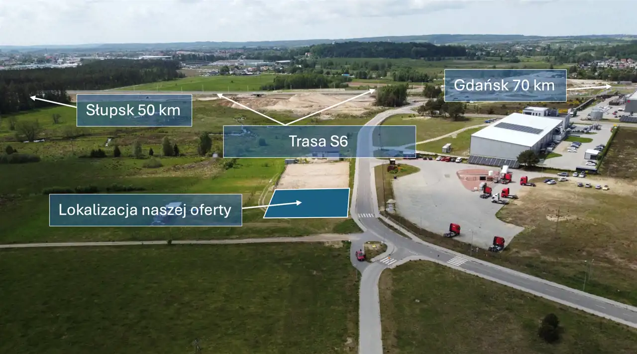 Dojazd do działki zapewnia droga wewnętrzna, bezpośrednio połączona z infrastrukturą drogową lęborskiego Osiedla Wschód. W niedalekiej odległości przebiega nowy odcinek obwodnicy wschodniej Lęborka stanowiący doskonałe połączenie komunikacyjne z Trójmiastem i Słupskiem. Działka objęta miejscowym planem zagospodarowania przestrzennego z przeznaczeniem pod zabudowę mieszkaniowo-usługową.