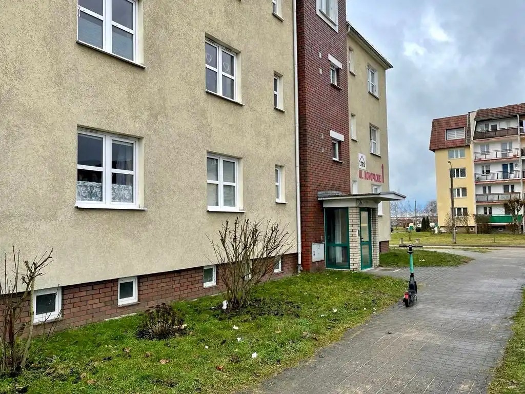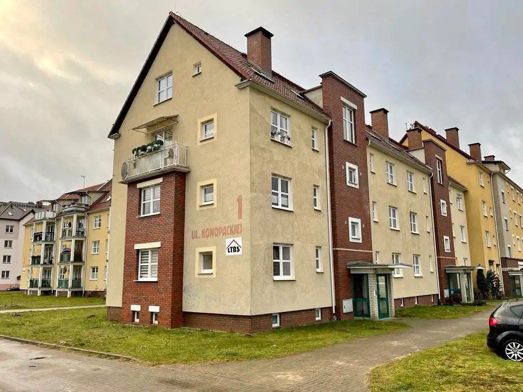 Oferujemy mieszkanie 1-pokojowe z balkonem, o powierzchni 34,5m2, zlokalizowane na trzecim piętrze bloku mieszkalnego położonego w Lęborku przy ulicy Haliny Konopackiej. Nieruchomość składa się z pokoju z wyjściem na balkon, kuchni i łazienki z WC. Do mieszkania przynależy również piwnica. Mieszkanie gotowe do zamieszkania bez dużych nakładów remontowych.
