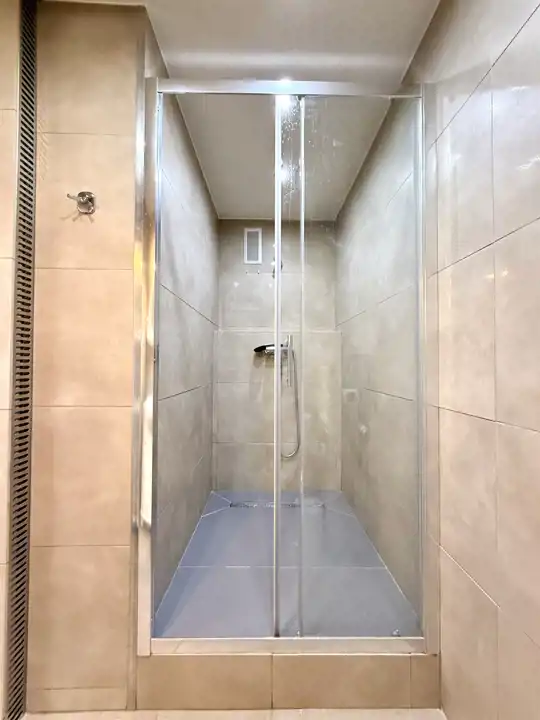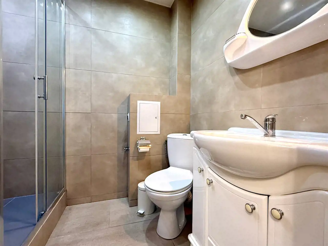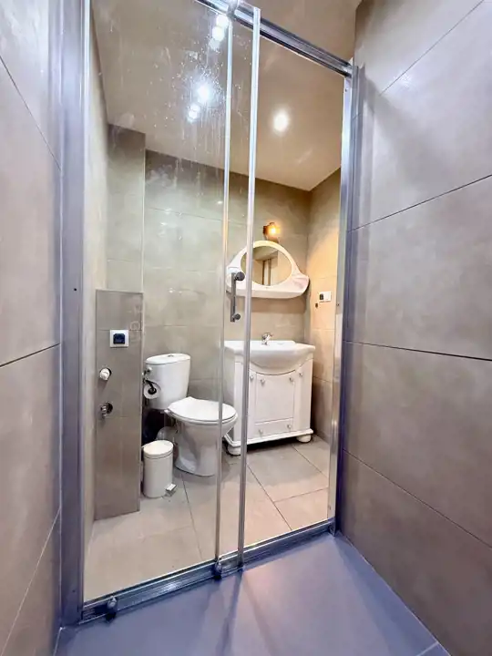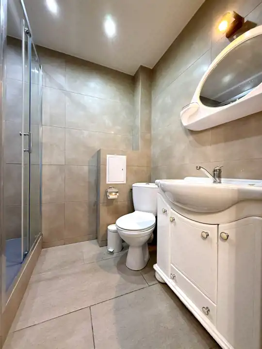 Łazienki z WC – z wnęką prysznicową, armaturą, umywalką i WC.