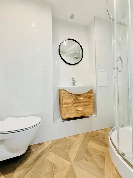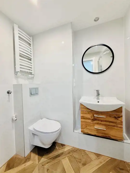 - Łazienka z WC – wyposażona w nowoczesną armaturę