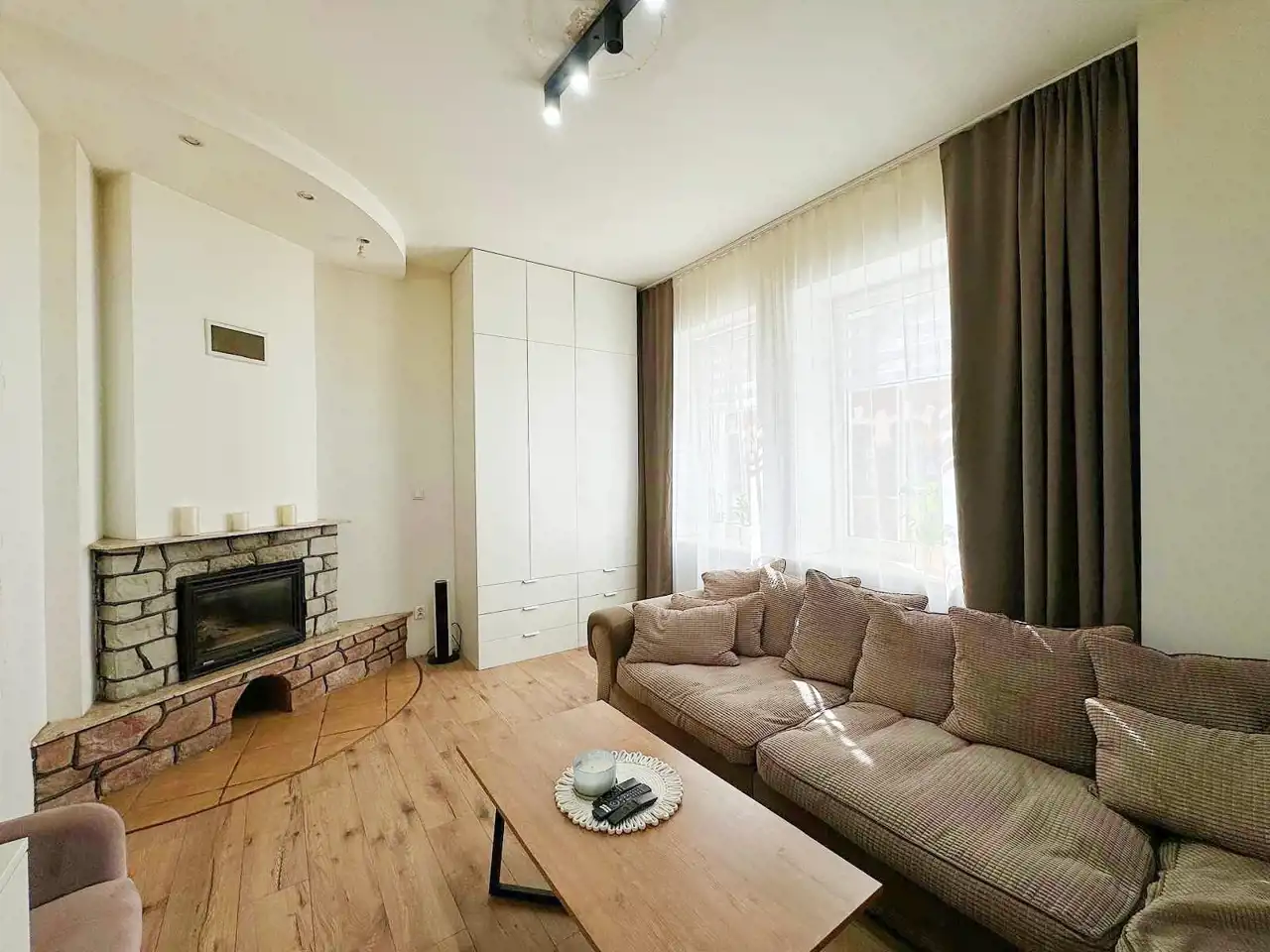 • kominek w salonie z rozprowadzeniem ciepła do sypialni