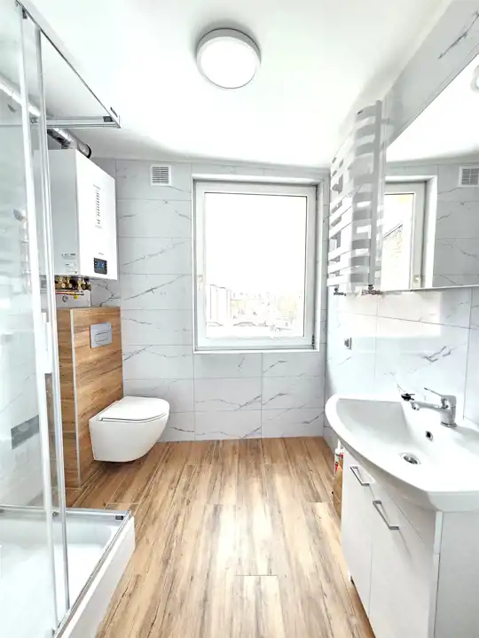 - Media Ogrzewanie: piec dwufunkcyjny; Woda: ciepła - piecyk gazowy; Gaz: tak - miejski