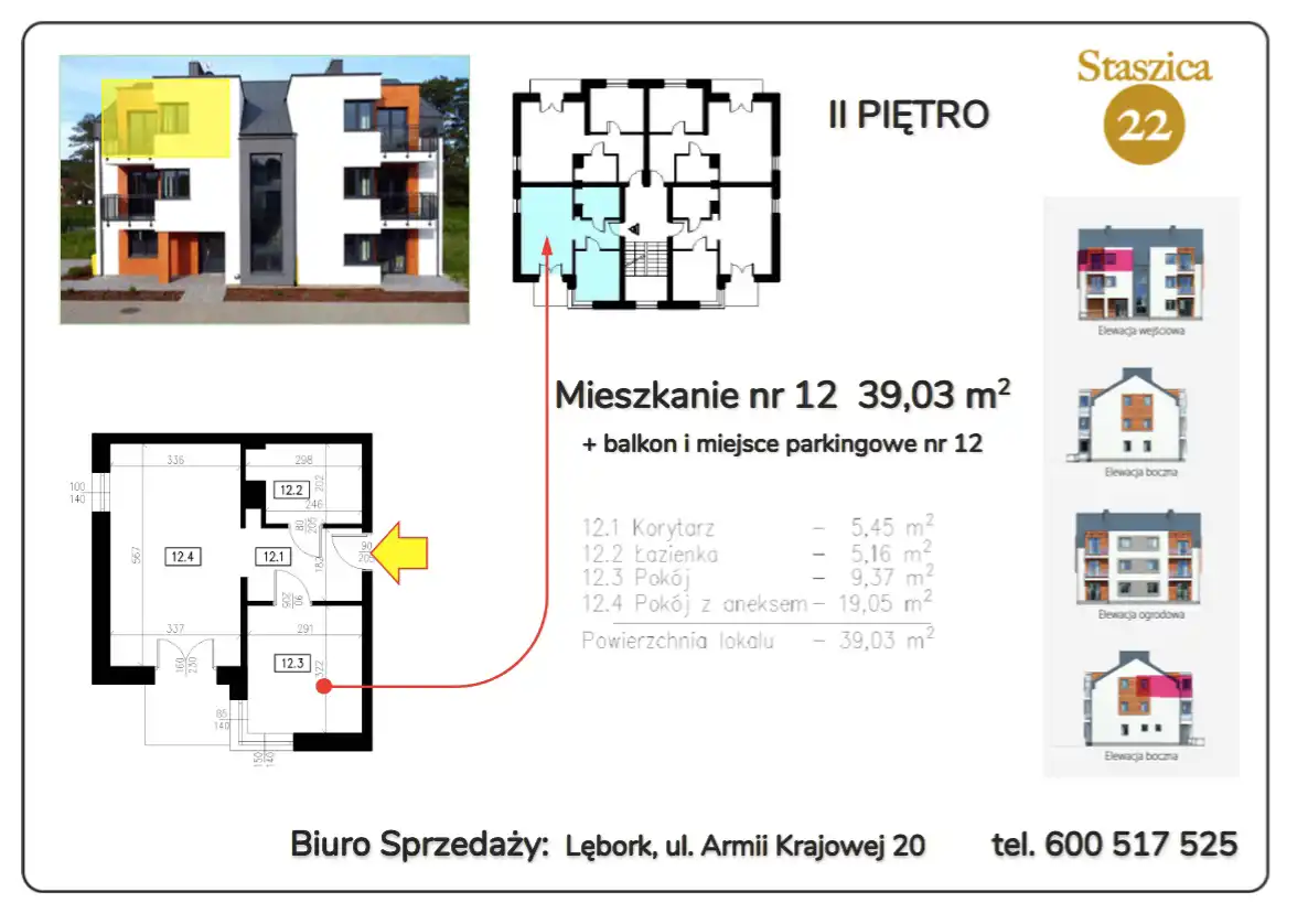 Oferujemy do sprzedaży mieszkanie 2-pokojowe o powierzchni 39,03 m2, zlokalizowane na II piętrze, w nowej inwestycji developerskiej położonej przy ulicy Staszica w Lęborku, stanowiącej doskonałą propozycję miejsca do zamieszkania, spełniającą oczekiwania Klientów wymagających podwyższonego standardu. Estetycznie wykończony, nowoczesny budynek wielorodzinny, funkcjonalne mieszkania z ogródkiem, ogrodzona i oświetlona posesja, na której znajdują się miejsca postojowe do wyłącznej dyspozycji mieszkańców oraz zamykana wiata rowerowa i śmietnikowa, podnoszą atrakcyjność inwestycji.