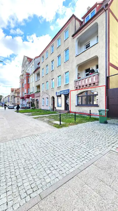 Przestronne, mieszkanie położone w ścisłym centrum Lęborka, przy ul. Zwycięstwa (vis a vis szpitala), o powierzchni 69,23m2. Lokal usytuowany jest na parterze trzypiętrowej stylowej kamienicy. Nieruchomość wymaga wkładu finansowego, jednak można od razu zamieszkać, a z czasem zaaranżować według własnych potrzeb i gustu. Wymienione instalacje - elektryczna, wodno-kanalizacyjna i gazowa, okna PCV, podłogi (panele, terakota). Składa się z przedpokoju, przestrzennego, widnego pokoju dziennego, sypialni, oddzielnej kuchni oraz łazienki z wc i prysznicem. Do mieszkania przynależy również piwnica. Lokal mieszkalny stanowi odrębną nieruchomość. Na podwórku nieruchomości usytuowane są miejsca parkingowe, a w pobliżu znajduje się cała infrastruktura – budynki użyteczności publicznej i instytucje usługowo-handlowe, szkoły, przychodnie (80m),przedszkola i kościoły. Reasumując ze względu na usytuowanie, położenie i wielofunkcyjność mieszkania, zarówno w aspekcie mieszkalnym, jak i komercyjnym oraz wspomniane atuty, oferta jest godna polecenia.