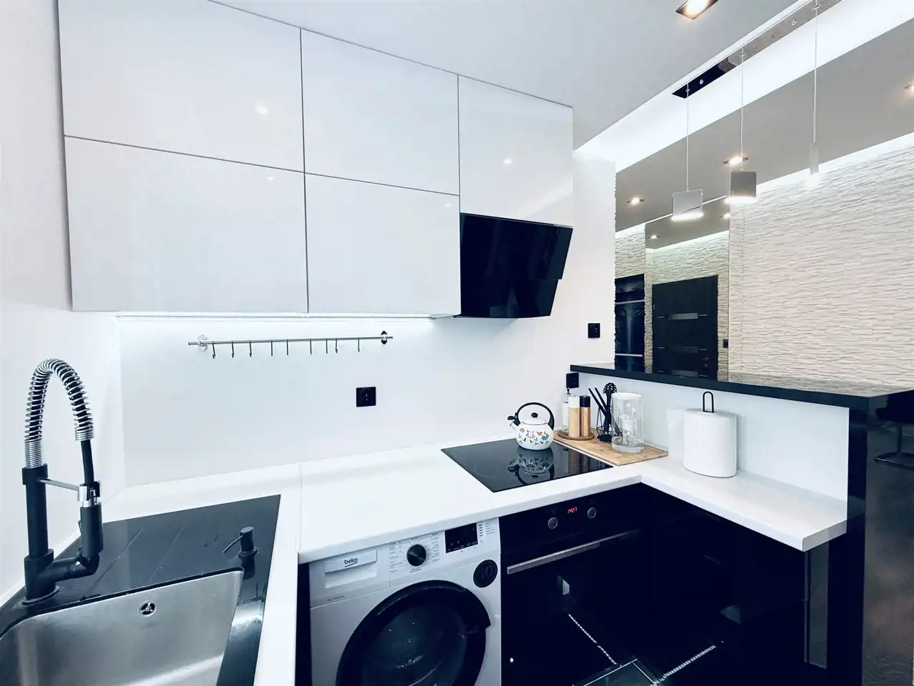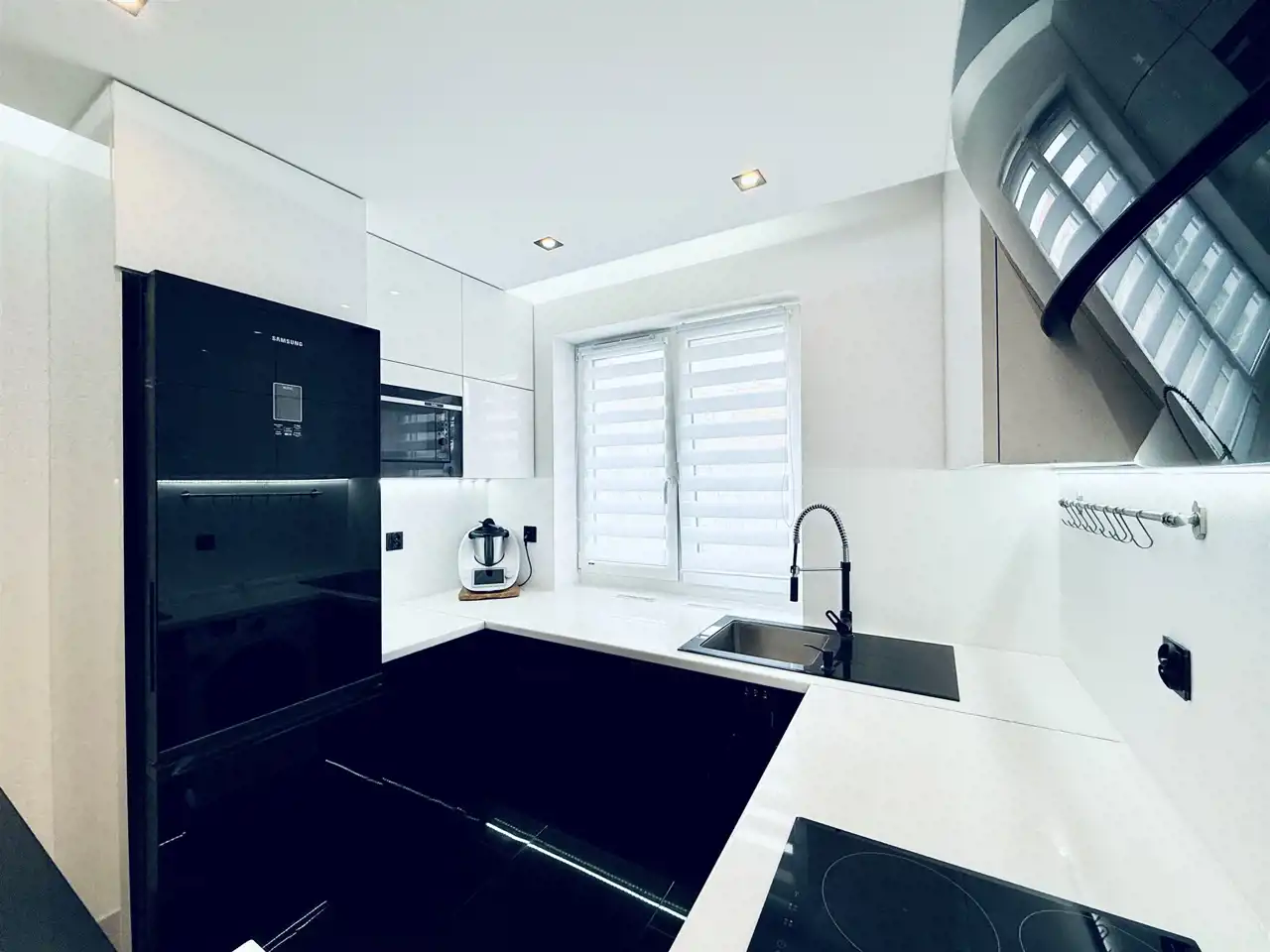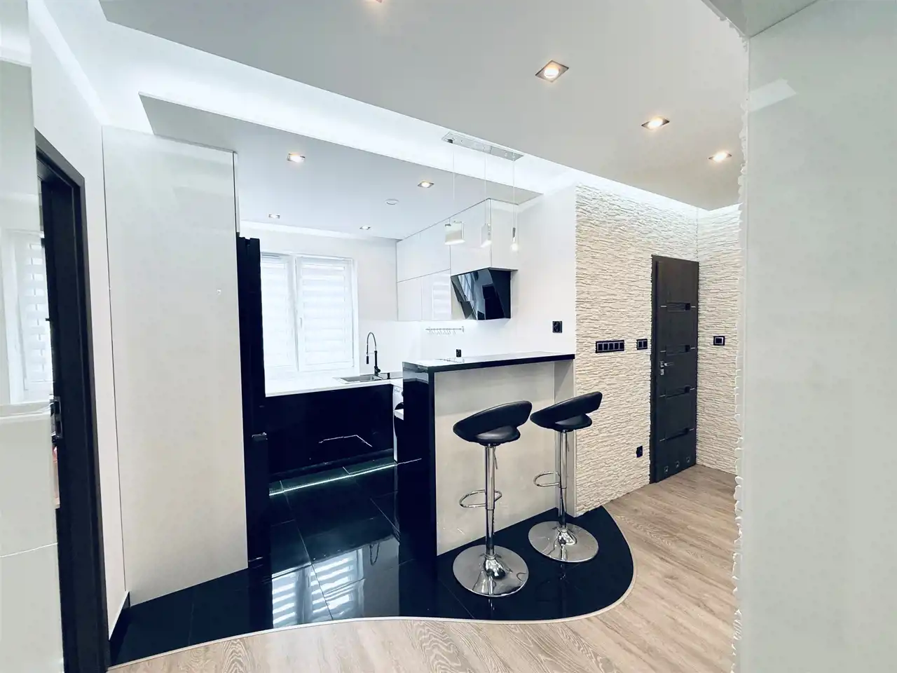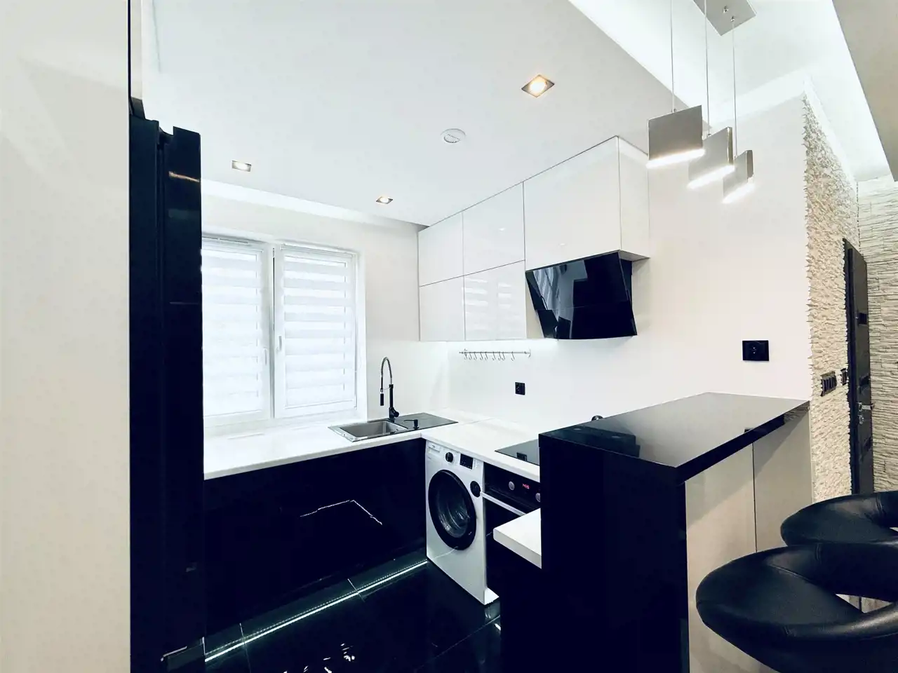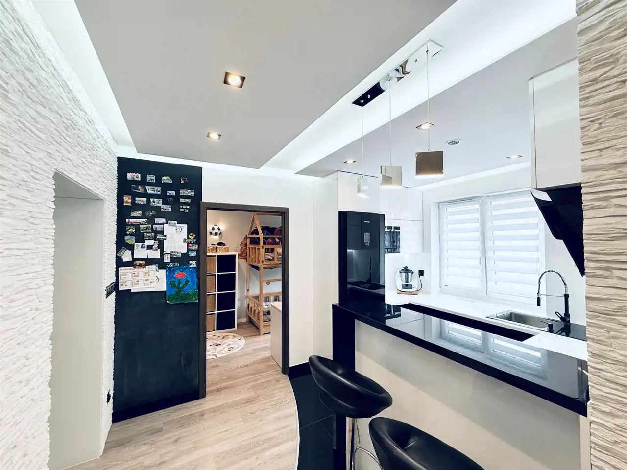 Nieruchomość została kompleksowo wyremontowana – w trakcie prac wymieniono wszystkie instalacje: elektryczną, hydrauliczną i wentylacyjną. Obniżono i docieplono sufity, które zostały dodatkowo podświetlone taśmami LED – to rozwiązanie poprawia estetykę wnętrza i buduje przyjemny klimat. Właściciel zadbał również o wygłuszenie ścian zewnętrznych, co podnosi komfort akustyczny mieszkania.