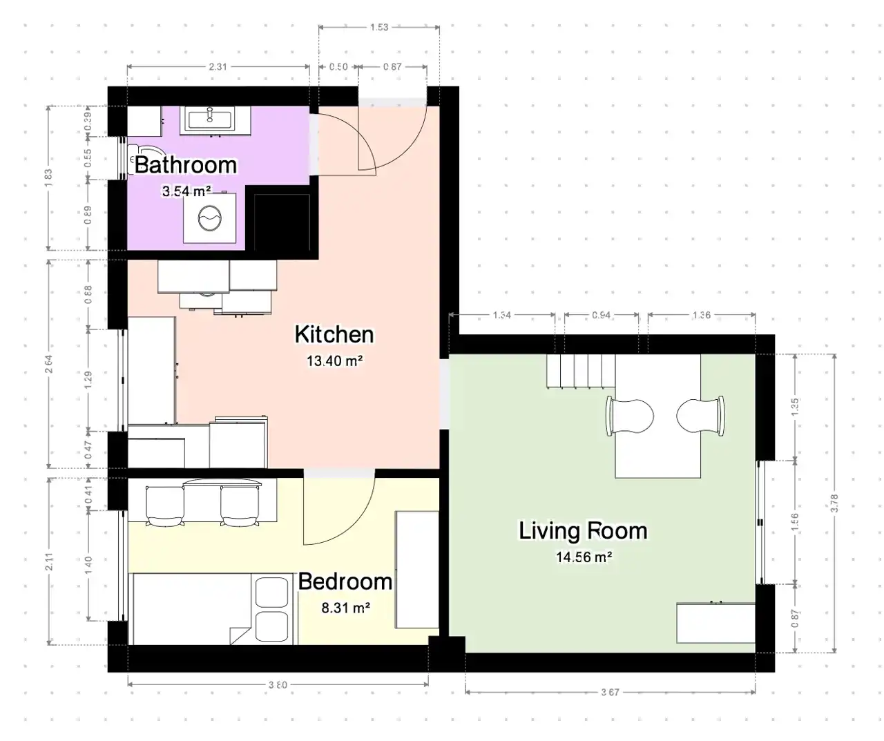 - Charakterystyka mieszkania 40.53 m2, 2 pokoje