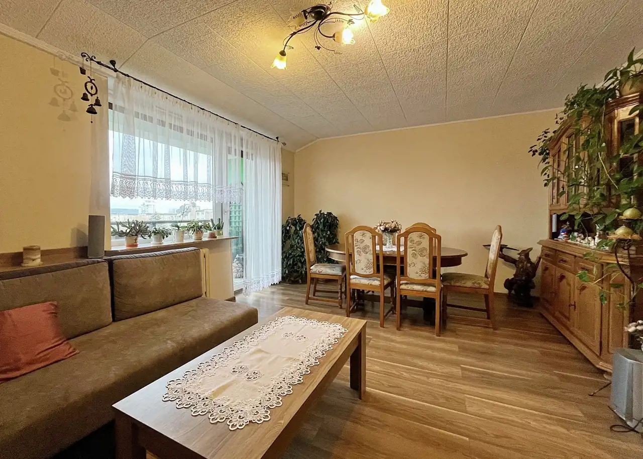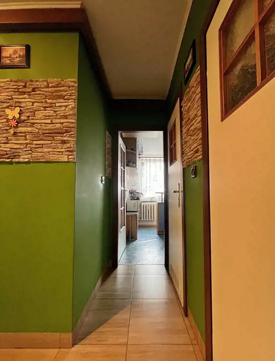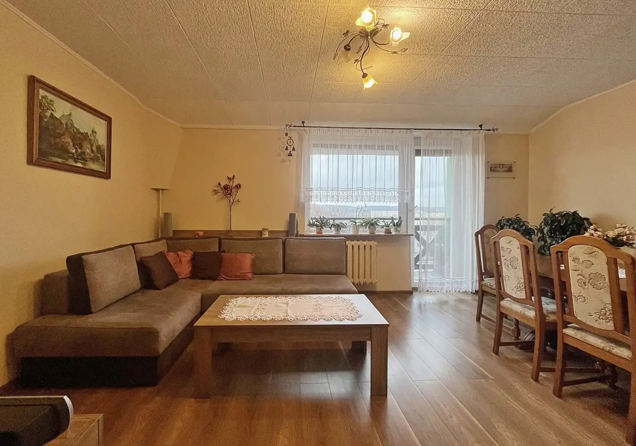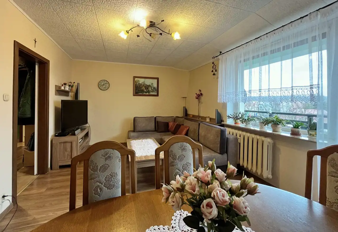 W środku trzy w pełni rozkładowe pokoje, osobna kuchnia, przedpokój, łazienka i oddzielne WC. Przynależna spora ponadto piwnica i przed budynkiem obszerny parking. Powierzchnia prawie 60m2 przestronna, ciepła, a z balkonu przyjemny widok na wyłaniający się w oddali las…
