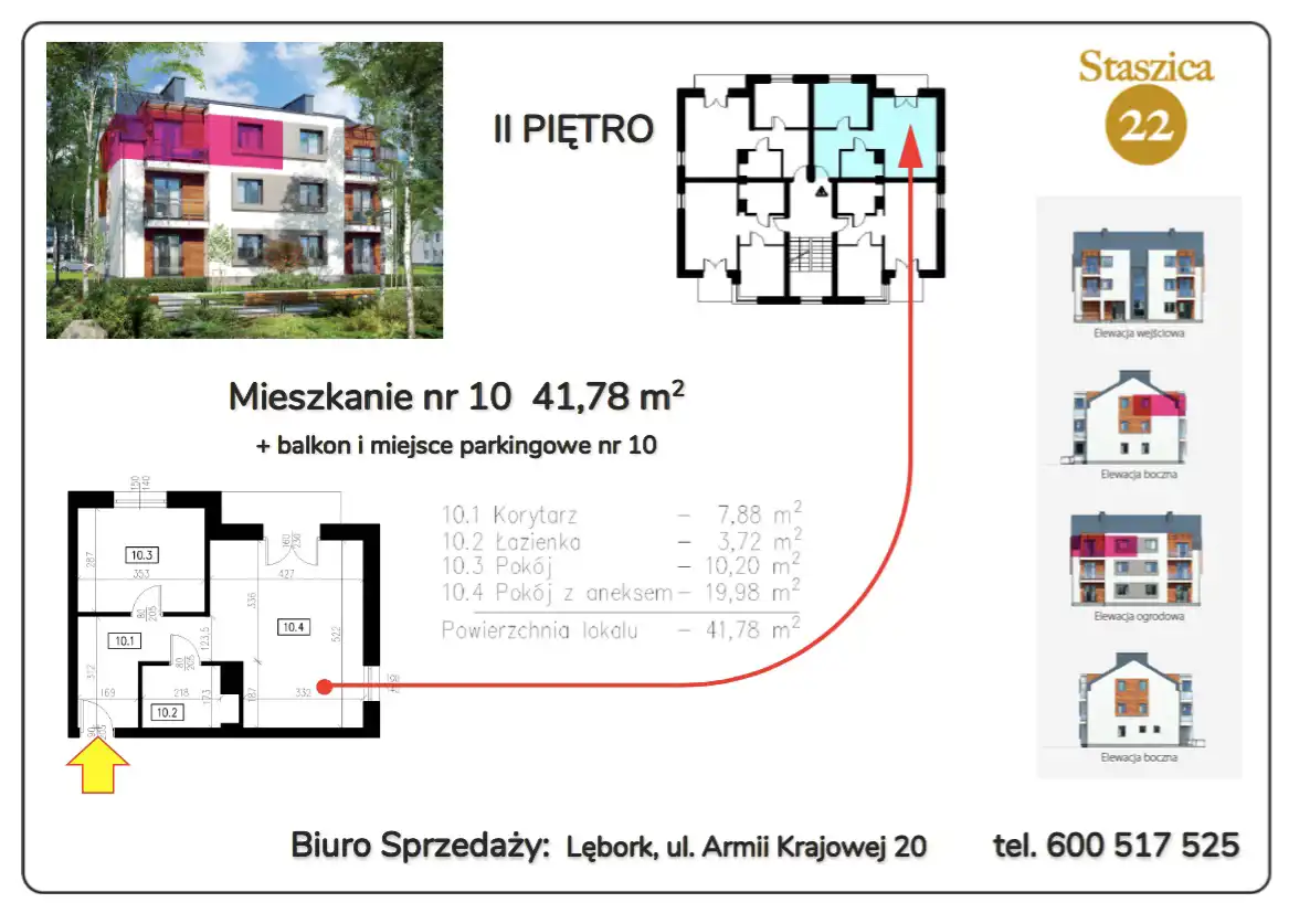 Oferujemy do sprzedaży mieszkanie 2-pokojowe o powierzchni 41,78 m2, zlokalizowane na II piętrze, w nowej inwestycji developerskiej położonej przy ulicy Staszica w Lęborku, stanowiącej doskonałą propozycję miejsca do zamieszkania, spełniającą oczekiwania Klientów wymagających podwyższonego standardu. Estetycznie wykończony, nowoczesny budynek wielorodzinny, funkcjonalne mieszkania z ogródkiem, ogrodzona i oświetlona posesja, na której znajdują się miejsca postojowe do wyłącznej dyspozycji mieszkańców oraz zamykana wiata rowerowa i śmietnikowa, podnoszą atrakcyjność inwestycji.