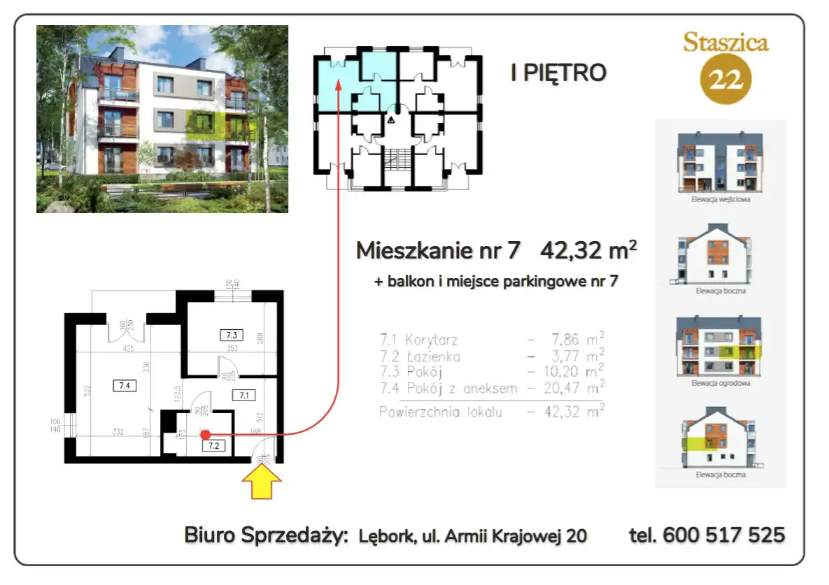 Oferujemy do sprzedaży mieszkanie 2-pokojowe o powierzchni 42,32 m2, zlokalizowane na I piętrze, w nowej inwestycji developerskiej położonej przy ulicy Staszica w Lęborku, stanowiącej doskonałą propozycję miejsca do zamieszkania, spełniającą oczekiwania Klientów wymagających podwyższonego standardu. Estetycznie wykończony, nowoczesny budynek wielorodzinny, funkcjonalne mieszkania z ogródkiem, ogrodzona i oświetlona posesja, na której znajdują się miejsca postojowe do wyłącznej dyspozycji mieszkańców oraz zamykana wiata rowerowa i śmietnikowa, podnoszą atrakcyjność inwestycji.