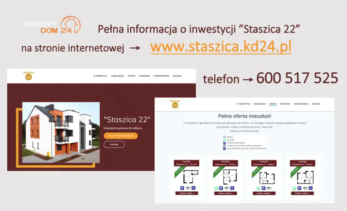 Pełna oferta mieszkań dostępnych do sprzedaży, zlokalizowanych w prezentowanym budynku oraz więcej informacji na temat prezentowanej inwestycji znajdziecie Państwo na stronie internetowej podanej na grafice dołączonej wśród zdjęć załączonych do prezentowanego mieszkania.