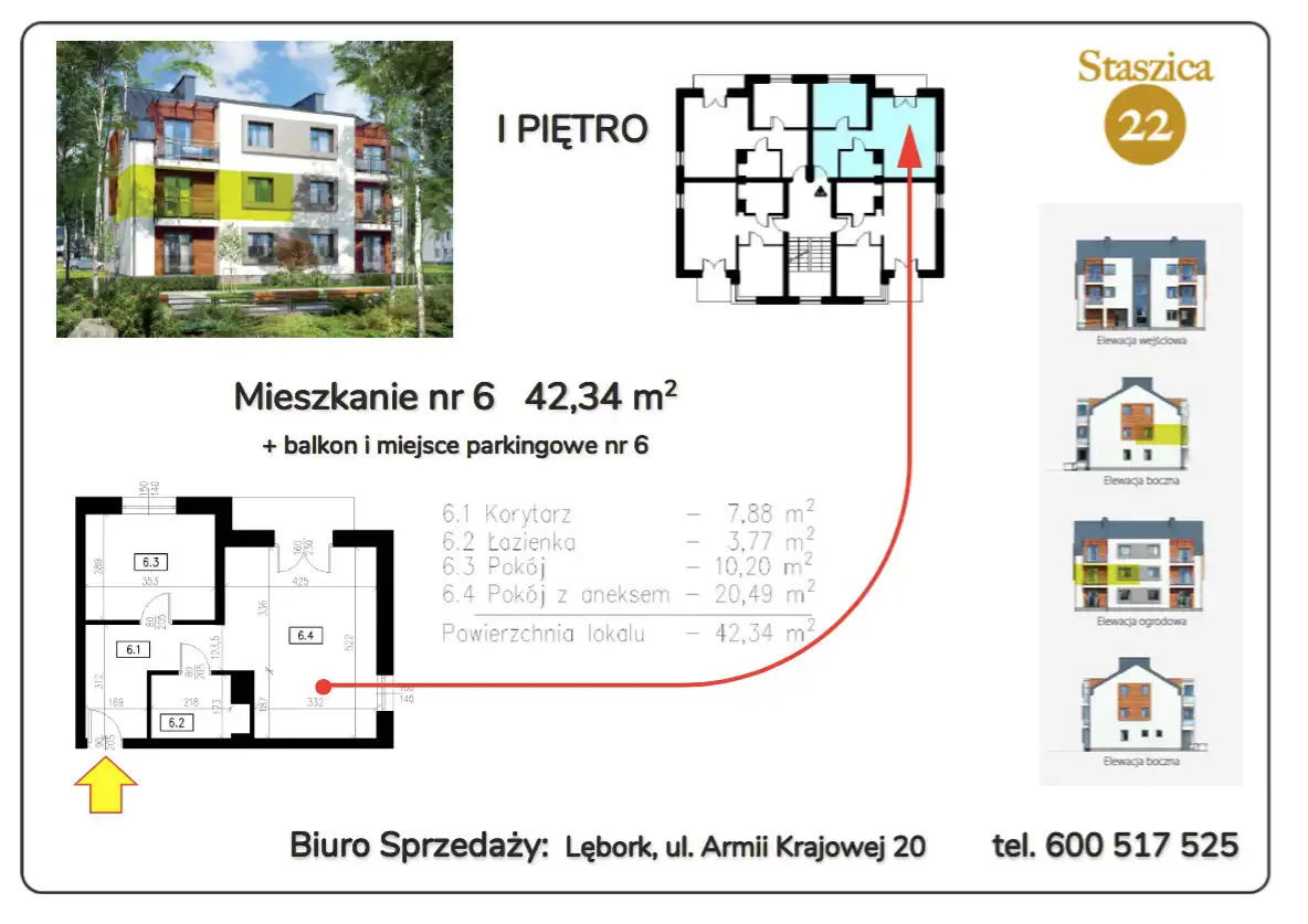 Oferujemy do sprzedaży mieszkanie 2-pokojowe o powierzchni 42,34 m2, zlokalizowane na I piętrze, w nowej inwestycji developerskiej położonej przy ulicy Staszica w Lęborku, stanowiącej doskonałą propozycję miejsca do zamieszkania, spełniającą oczekiwania Klientów wymagających podwyższonego standardu. Estetycznie wykończony, nowoczesny budynek wielorodzinny, funkcjonalne mieszkania z ogródkiem, ogrodzona i oświetlona posesja, na której znajdują się miejsca postojowe do wyłącznej dyspozycji mieszkańców oraz zamykana wiata rowerowa i śmietnikowa, podnoszą atrakcyjność inwestycji.
