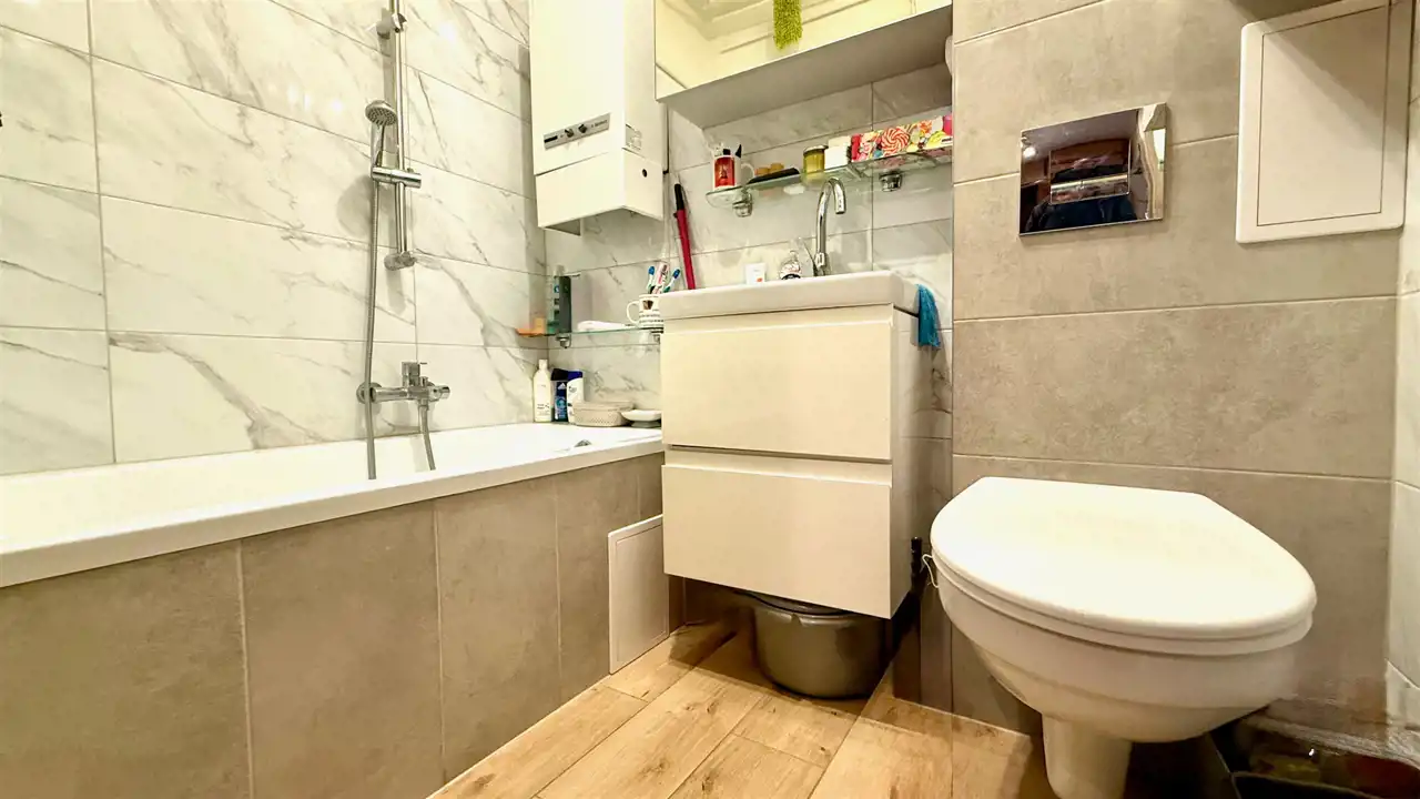 Łazienka z WC: Świeżo po remoncie, wykończona w nowoczesnym standardzie.