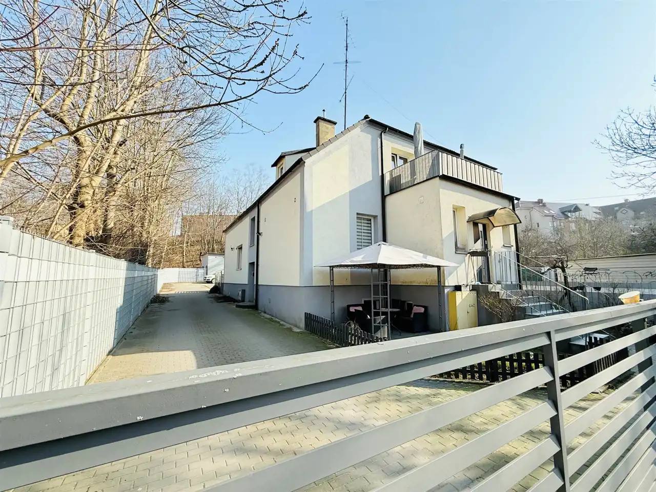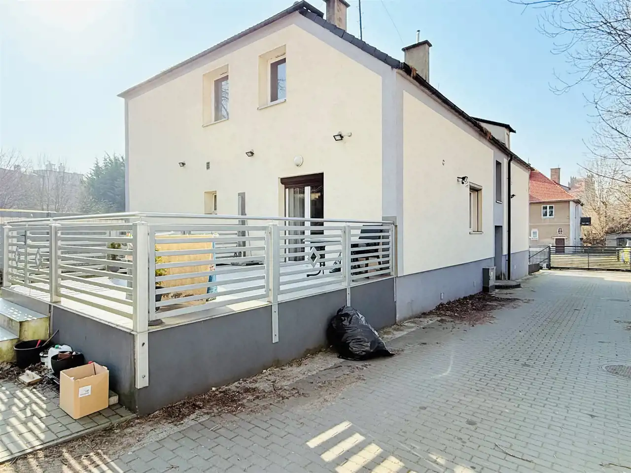 - Zadbana posesja wyłożona kostką brukową – estetyczne i funkcjonalne otoczenie.