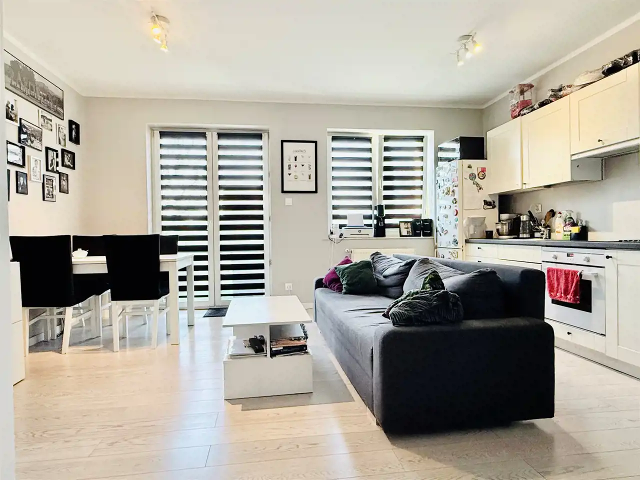 - Przestronny salon z aneksem kuchennym i wyjściem na duży balkon, który zapewnia dodatkową przestrzeń do relaksu.