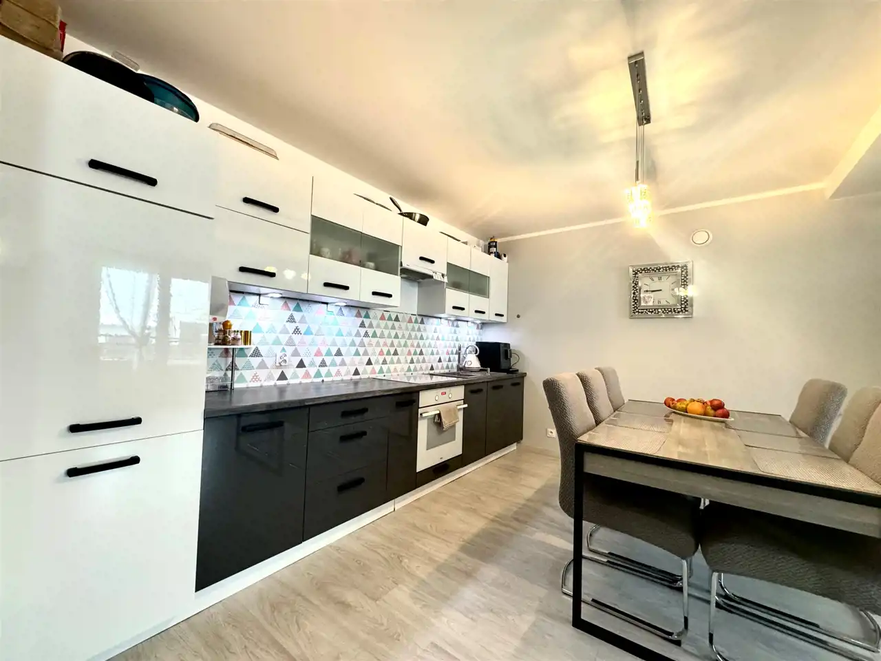 -przestronny salon z aneksem kuchennym i częścią jadalnianą, z wyjściem na duży słoneczny balkon, usytuowany od strony zachodniej – idealne miejsce na relaks i spotkania z bliskimi