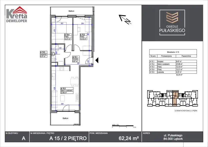 - Charakterystyka mieszkania 62.24 m2, 3 pokoje