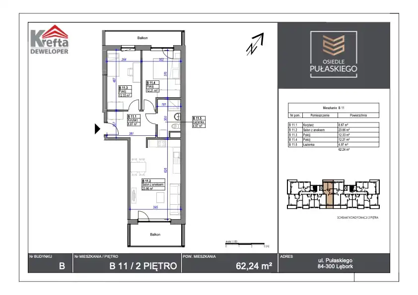 - Charakterystyka mieszkania 62.24 m2, 3 pokoje