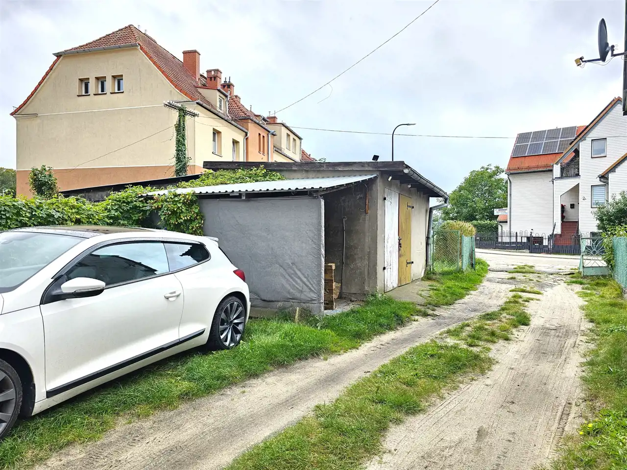 Nieruchomość położona jest na ogrodzone działce o łącznej powierzchni 910 m² – udział w gruncie wynosi 50% (współwłasność z sąsiadką). Na terenie posesji znajduje się miejsce do parkowania samochodów, dwa mniejsze ogródki z przodu głównego budynku, wspomniany zagospodarowany ogródek przed drugim mieszkaniem, a także pomieszczenie gospodarcze z wiatą, które może pełnić funkcję garażu, warsztatu lub składziku.