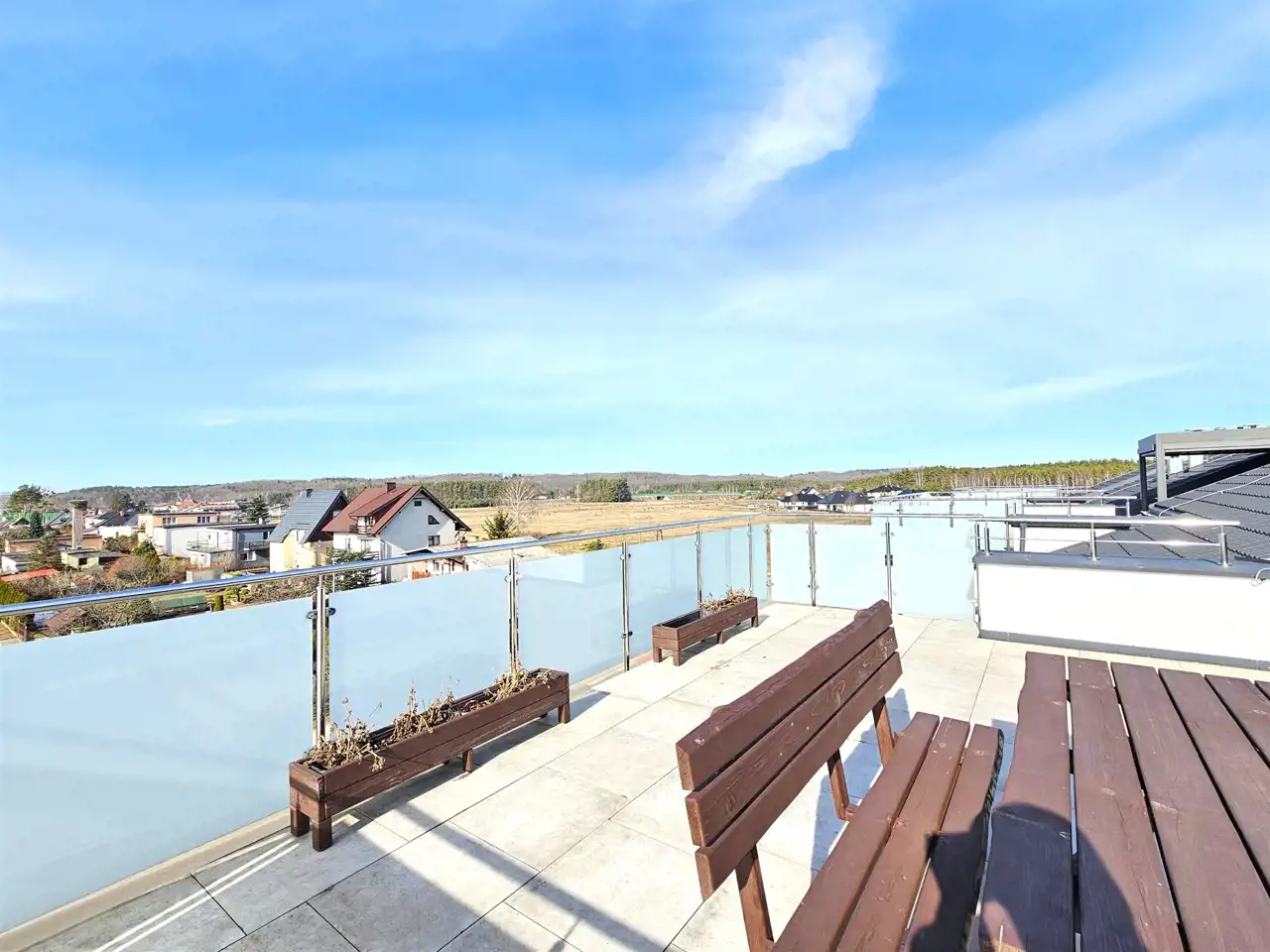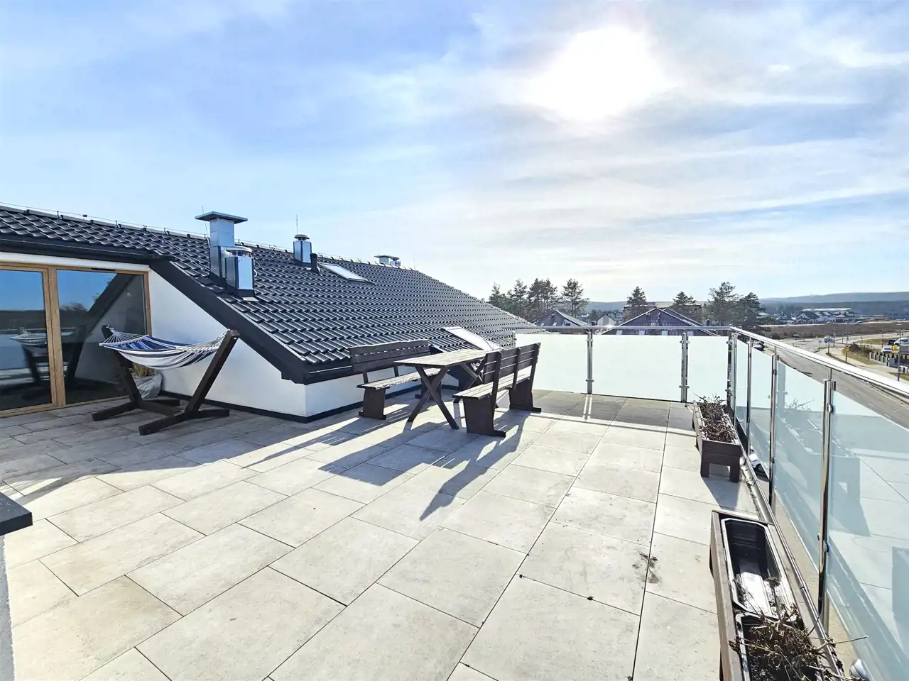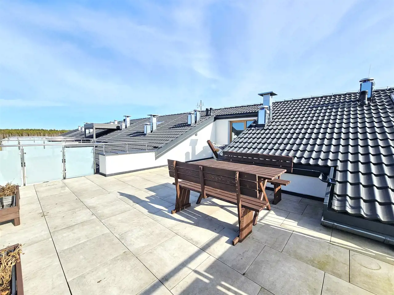 wyjście na duży taras o powierzchni 36,75 m², który stanowi wyjątkową przestrzeń do relaksu, spotkań z bliskimi czy stworzenia prywatnej strefy wypoczynku na świeżym powietrzu