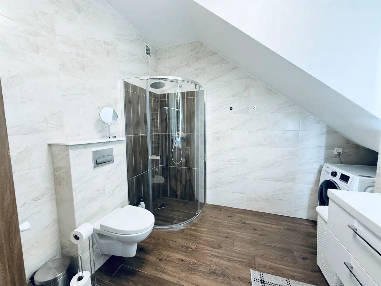 Do mieszkania przynależy garaż na dwa samochody, pomieszczenie gospodarcze oraz ogródek, co znacząco podnosi komfort codziennego użytkowania i nadaje nieruchomości charakter zbliżony do domu jednorodzinnego.