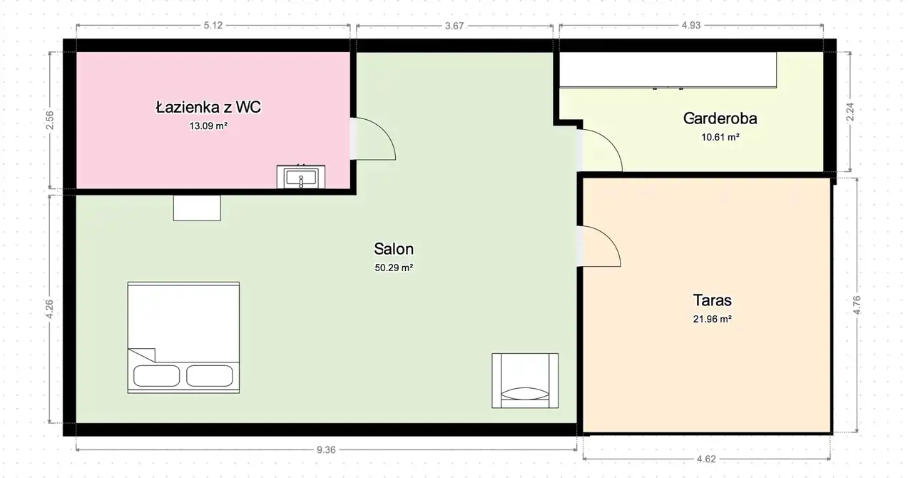 Mieszkanie wyróżnia się przemyślanym układem, dużą ilością naturalnego światła oraz wyraźnym podziałem na strefę dzienną i prywatną. Duże przeszklenia, przestronny taras, balkon oraz dodatkowy ogród tworzą unikalne warunki do życia, które rzadko spotyka się w mieszkaniach w zabudowie wielorodzinnej.