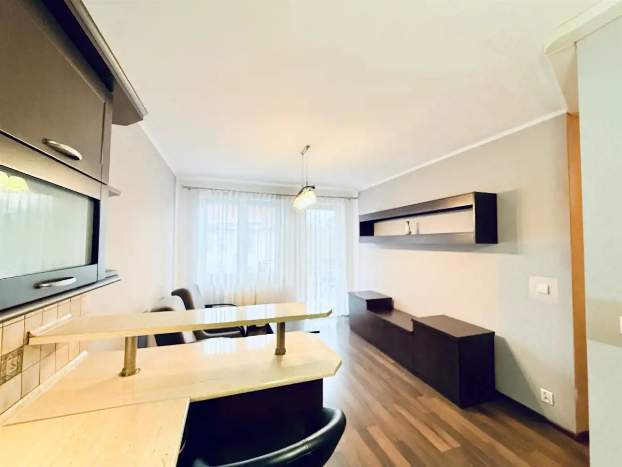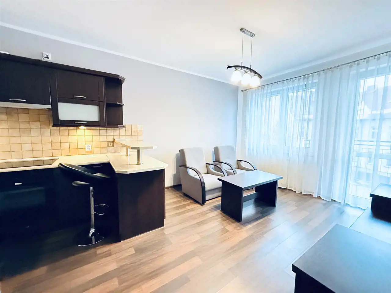 jasny pokój dzienny z aneksem kuchennym i wyjściem na balkon,
