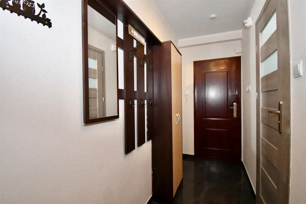 Oferujemy na wynajem mieszkanie o powierzchni 43,5m2 usytuowane na 2 piętrze w bloku położonym w Lęborku przy ul. Jagiellońskiej. Nieruchomość składa się z dwóch pokoi - w tym jeden z wyjściem na balkon, kuchni, łazienki z WC oraz przedpokoju. Kuchnia i łazienka umeblowane i wyposażone. Budynek czteropiętrowy, docieplony. Niskie opłaty eksploatacyjne. Czynsz do Spółdzielni Mieszkaniowej ok.400 zł w skład którego wchodzą opłaty administracyjne, zaliczki na wodę (dodatkowo zimą C.O.) Zabezpieczenia: domofon, drzwi antywłamaniowe. Do lokalu przynależy piwnica. Bardzo dobra lokalizacja. W pobliżu urzędy, Biedronka, Netto, szkoły i przedszkole.