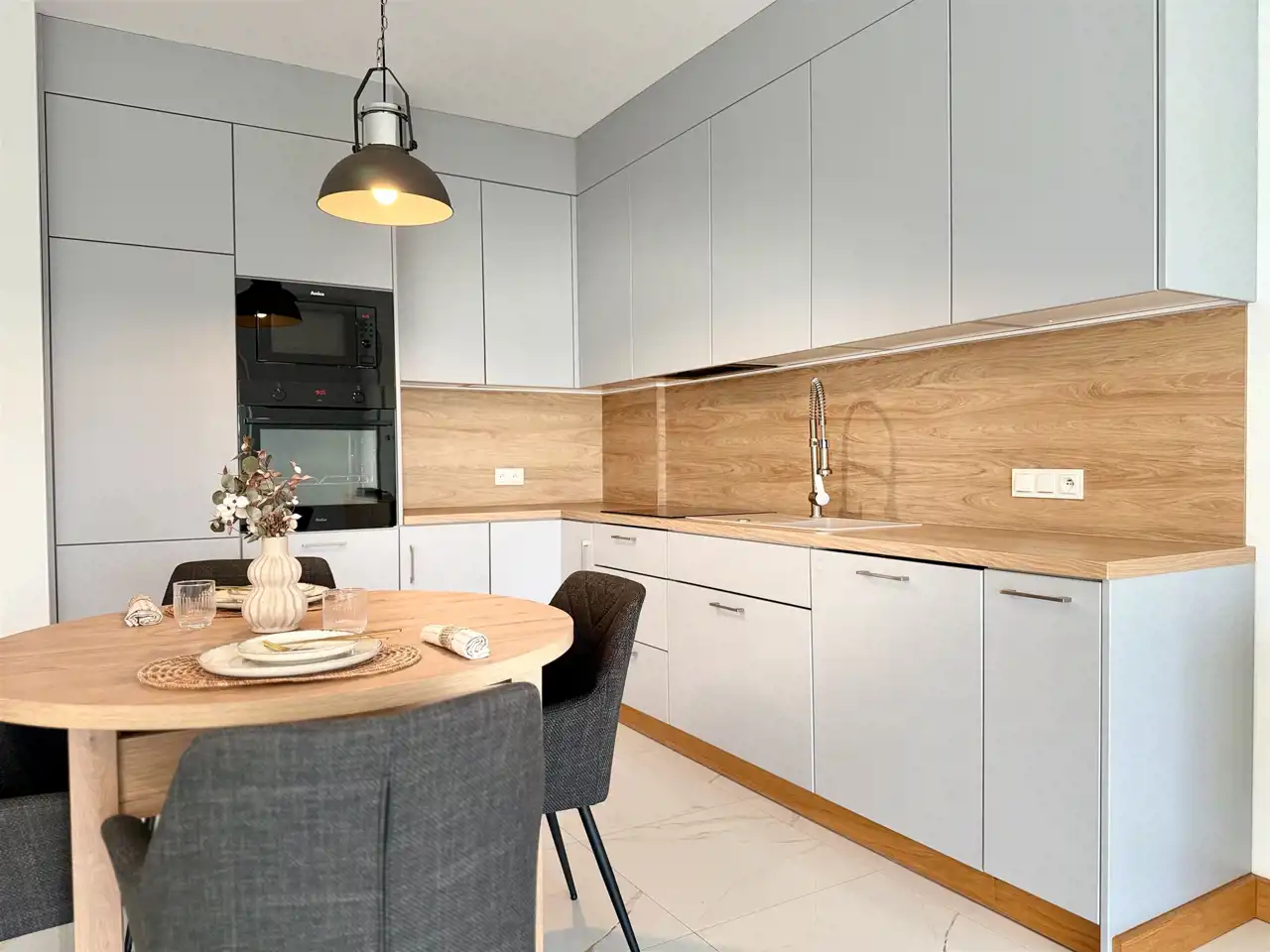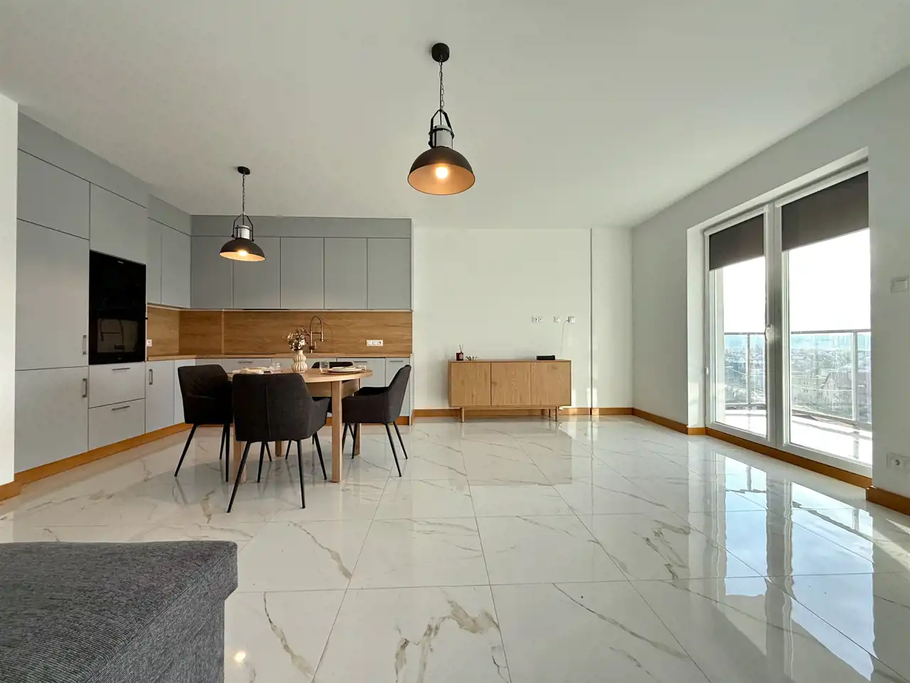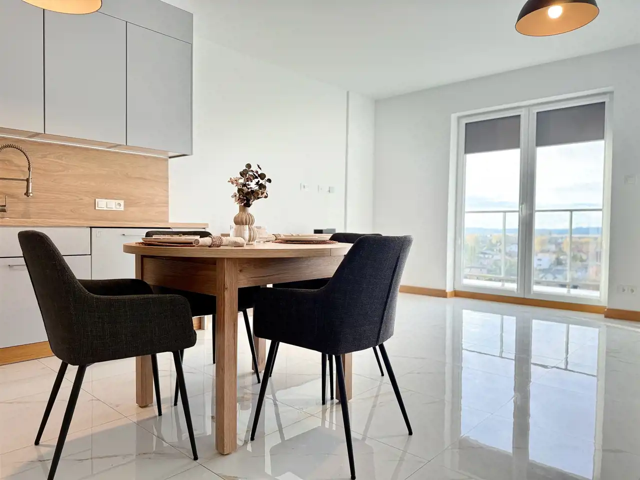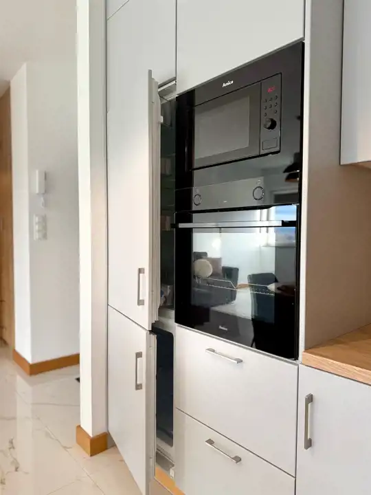 - wyposażona kuchnia (płyta indukcyjna, piekarnik, okap, zmywarka, lodówka, stół i krzesła)