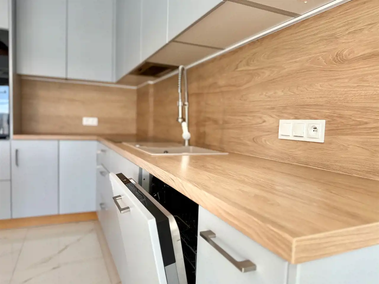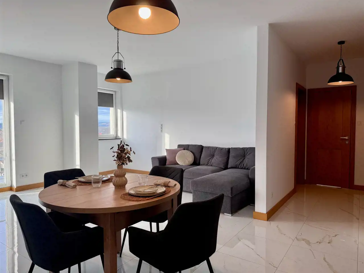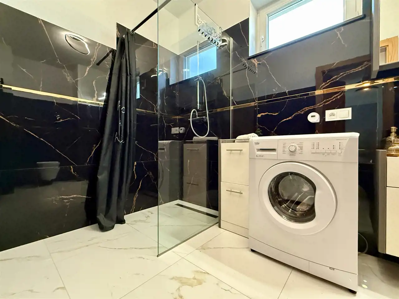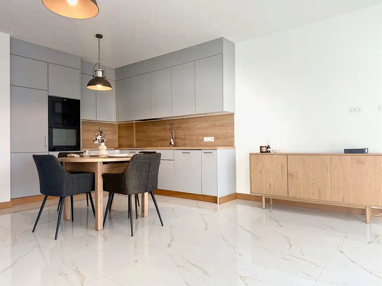 - wyposażona kuchnia (płyta indukcyjna, piekarnik, okap, zmywarka, lodówka, stół i krzesła)