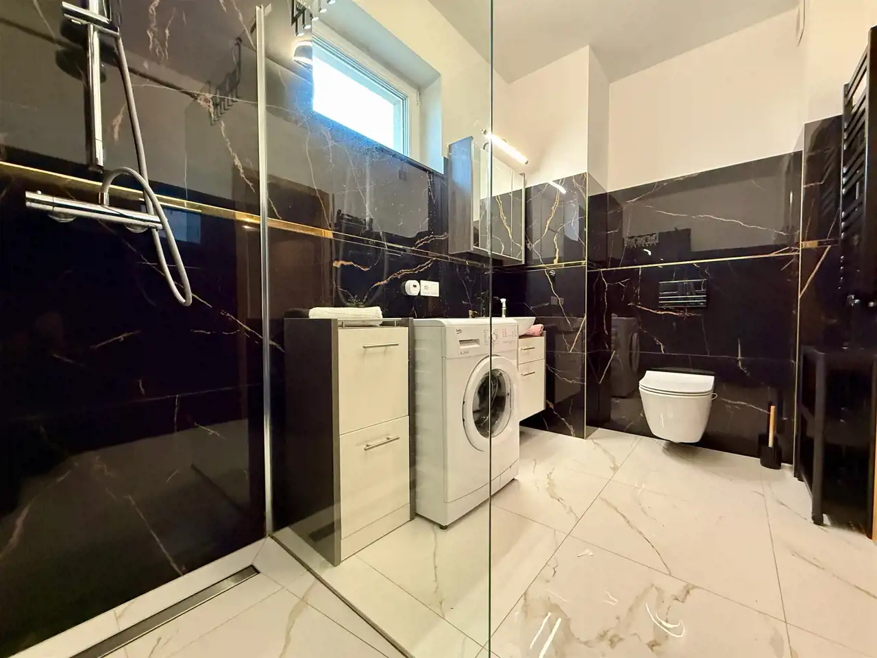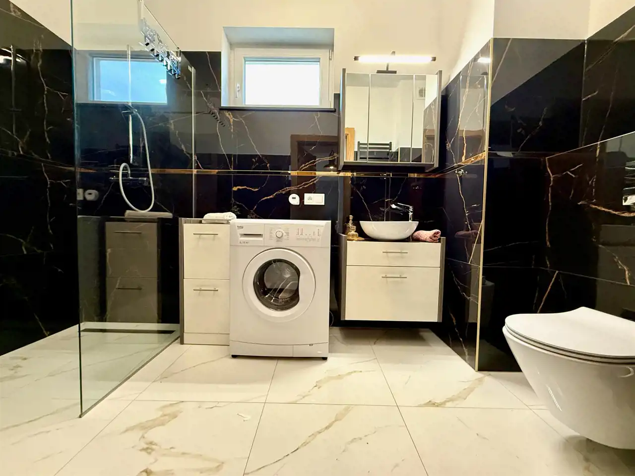 - wyposażona łazienka (prysznic, wc, lustro, umywalka z baterią i szafką)
