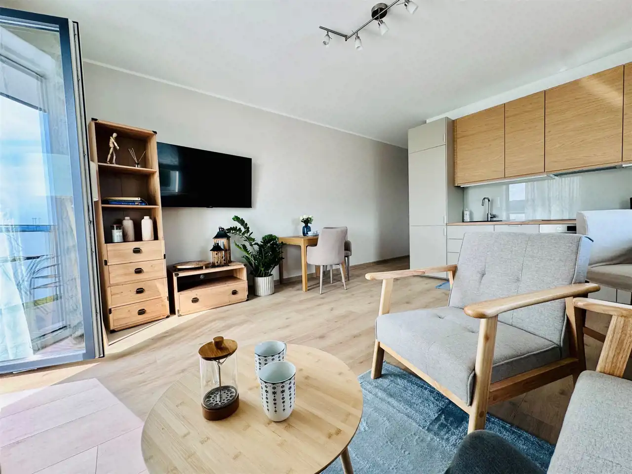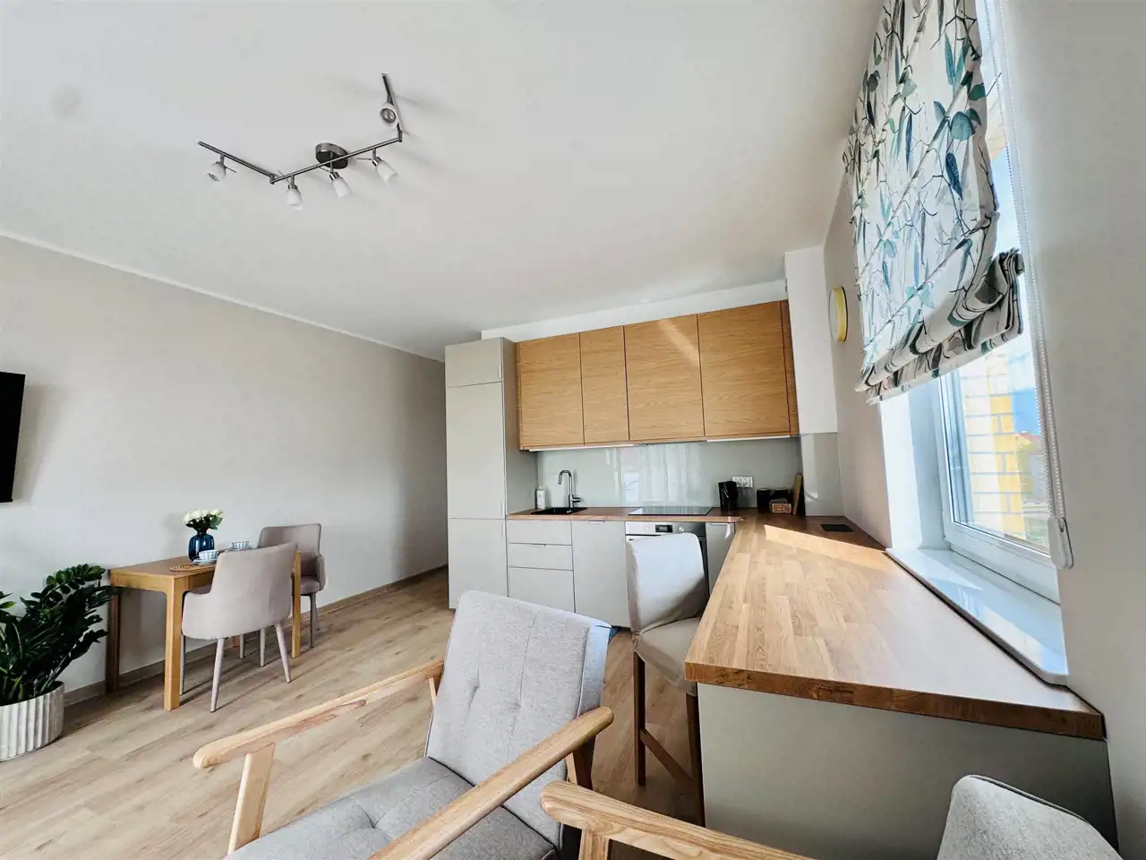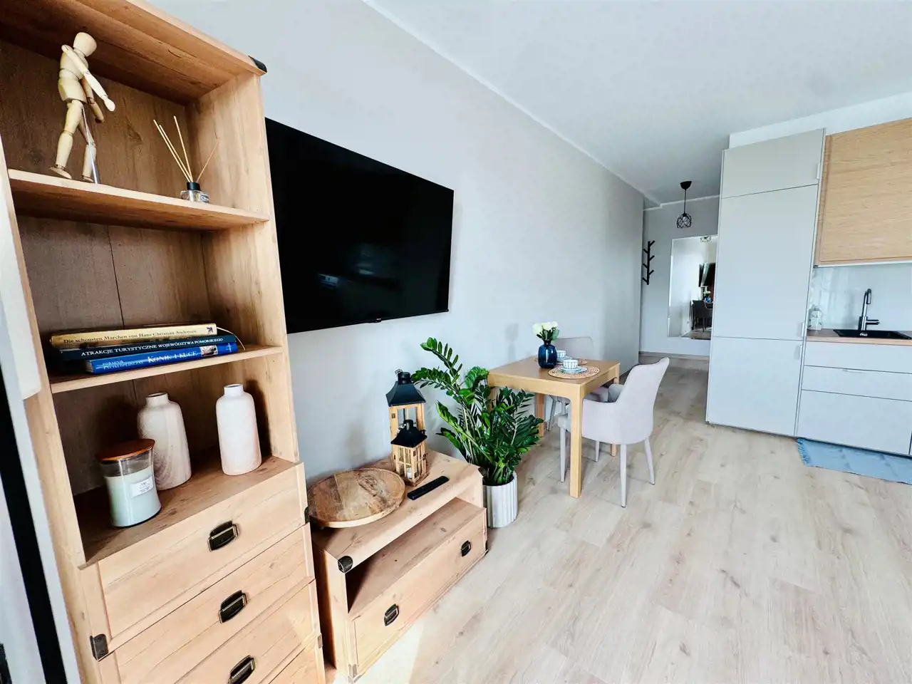 Mieszkanie jest w pełni wyposażone i gotowe do zamieszkania od zaraz. Składa się z przestronnego salonu, z którego można wyjść na duży balkon. To idealne miejsce do relaksu na świeżym powietrzu, gdzie można cieszyć się poranną kawą czy wieczornym odpoczynkiem. Komfortowa sypialnia gwarantuje spokojny wypoczynek, a nowoczesna łazienka z WC urządzona jest z dbałością o funkcjonalność i estetykę. Dodatkowa garderoba zapewnia przestrzeń do przechowywania, dzięki czemu mieszkanie jest jeszcze bardziej praktyczne.