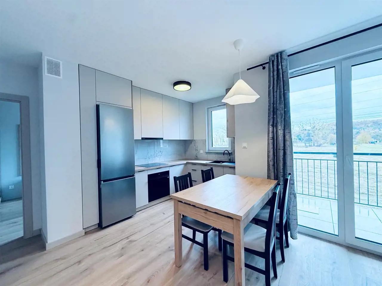 Przestronny salon z aneksem kuchennym i wyjściem na balkon z ekspozycją południową – idealne miejsce do relaksu z widokiem na zieleń i las