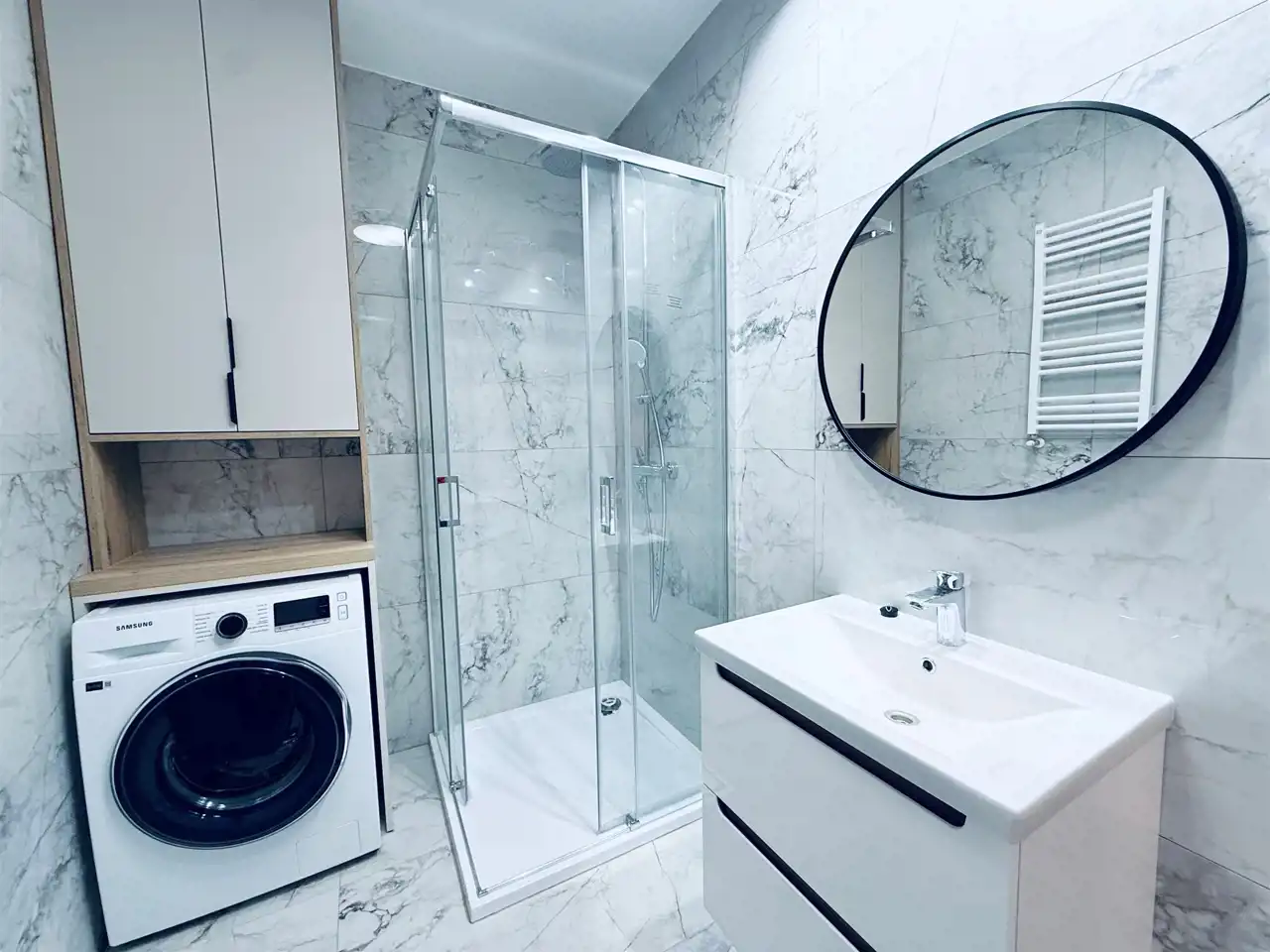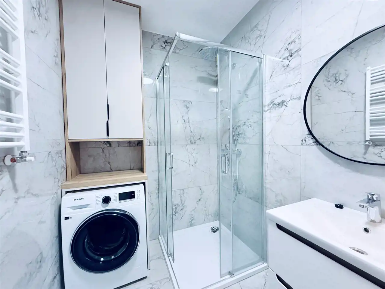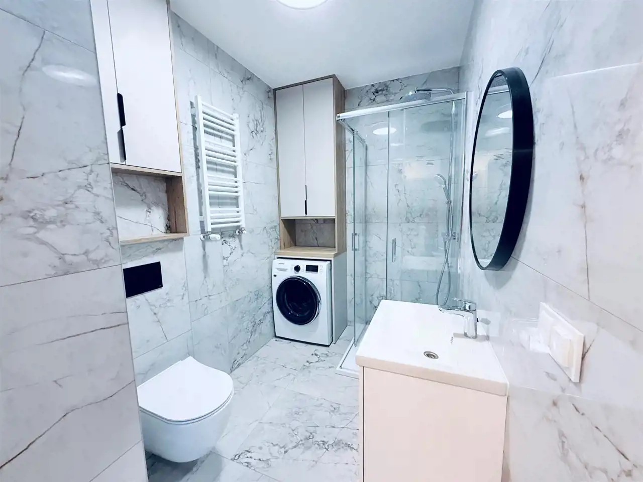 Łazienka z WC – urządzona w nowoczesnym stylu, z kabiną prysznicową, pralką i meblami w zabudowie